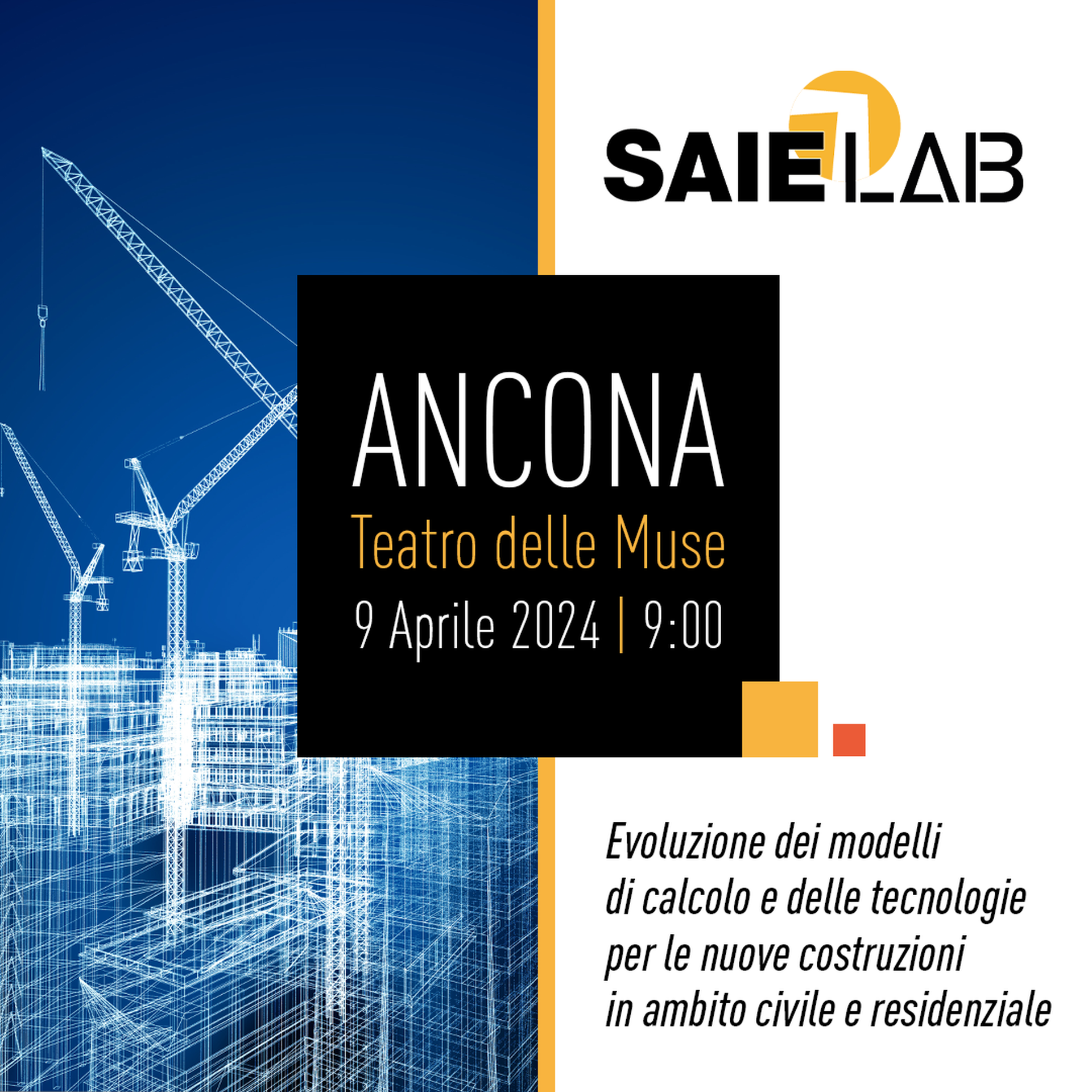 Ad ospitare la prima tappa dei Saie Lab 2024 sarà Ancona, il 9 aprile alle ore 9.00 presso il Teatro delle Muse, con un focus dedicato al tema dell’evoluzione dei modelli di calcolo e delle tecnologie per le nuove costruzioni in ambito civile e residenziale.