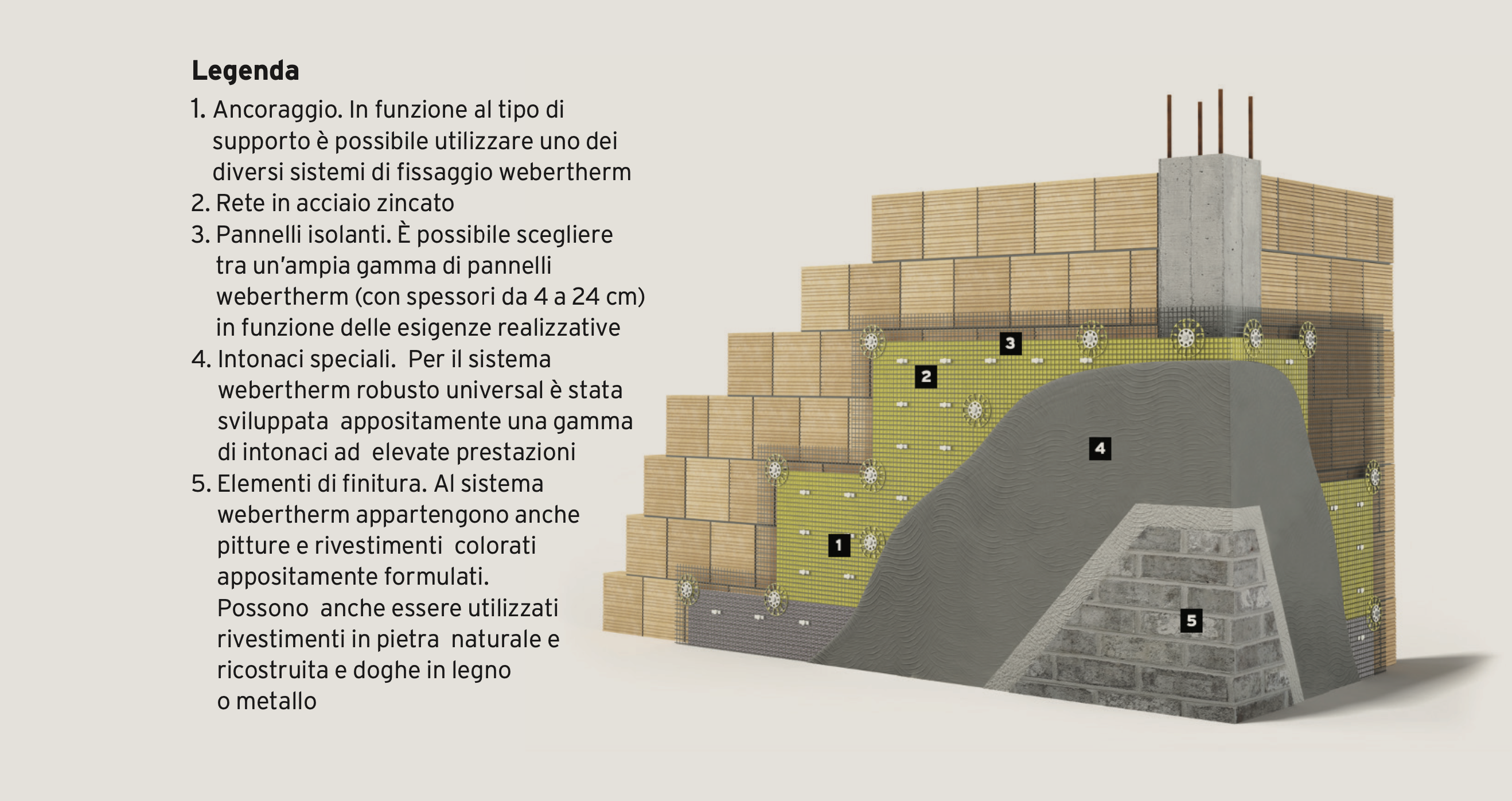 Saint-Gobain Italia propone un ventaglio di soluzioni per l’isolamento termico – che si compone di 8 tipologie di sistemi “a cappotto” – studiate per ogni esigenza e tipologia di intervento. Tra queste, webertherm robusto universal, oltre ai più comuni vantaggi che un cappotto offre, consente l’applicazione di ogni tipo di rivestimento in facciata: dalla semplice pittura fino all’installazione di elementi pesanti, quali materiali lapidei naturali o ricostruiti e ceramiche di grandi formati.