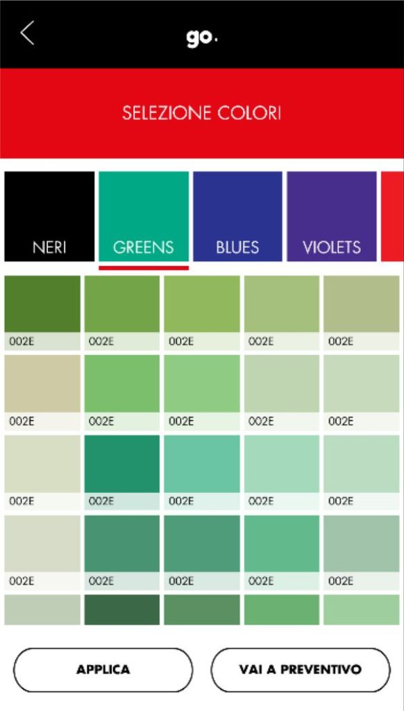 Completate le prime scelte, Go.Color permette di visualizzare in tempo reale il colore e l’effetto desiderato direttamente sulle pareti di casa grazie alla funzione di realtà aumentata, in modo pratico e dinamico e salvare i progetti realizzati così da accedervi in qualsiasi momento. Le ultime due sezioni dell’applicazione offrono infine la possibilità di fornire preventivi immediati ai clienti e cercare lo Store Locator più vicino.