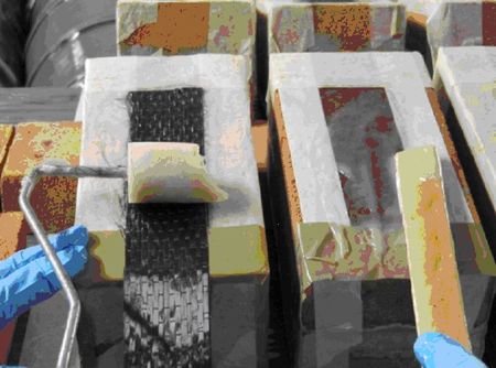 I campioni (mattone rinforzato con tessuto in composito) sono stati realizzati tutti insieme e successivamente sottoposti a prova dai diversi laboratori, adottando diversi sistemi di prova per misurare la resistenza allo scorrimento per taglio (shear test).