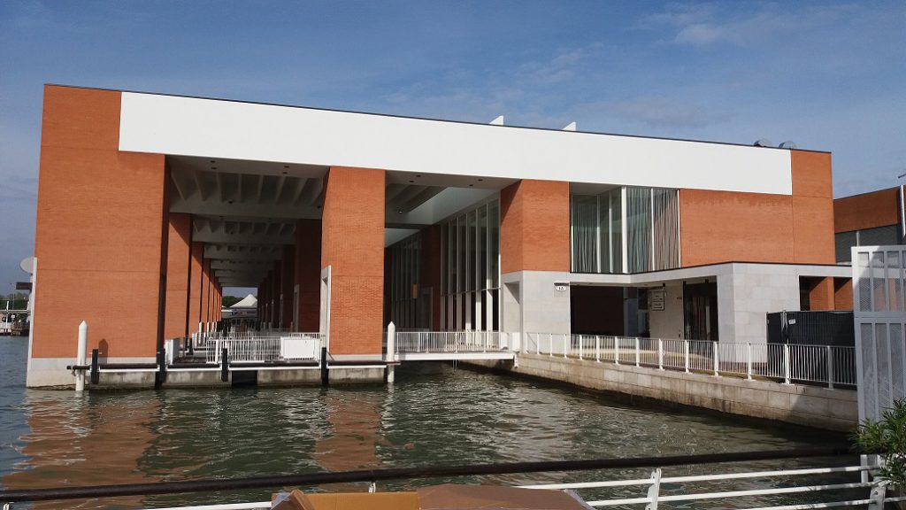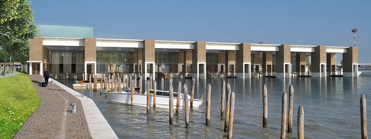 L’edificio presso la darsena si configura come uno spazio aperto coperto rettangolare, con una distribuzione a pettine che raccoglie il flusso di passeggeri provenienti via acqua mediante moli di attracco, ortogonali alla riva, per i motoscafi-taxi o i traghetti e lo accompagna lungo la riva fino all’innesto della linea dei tappeti mobili posta all’estremità sud-occidentale.