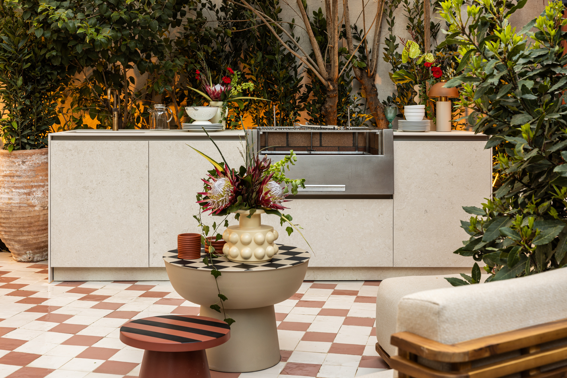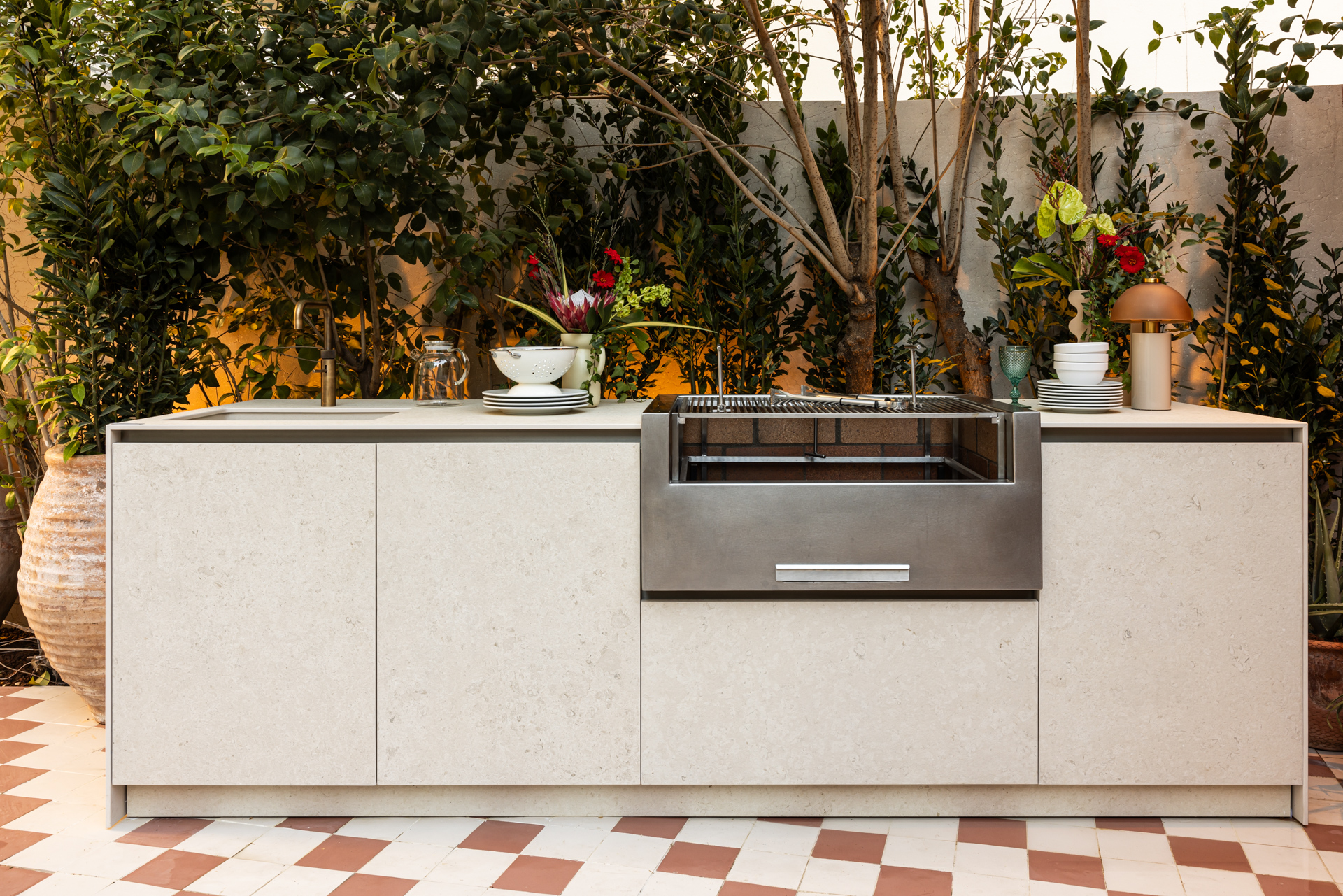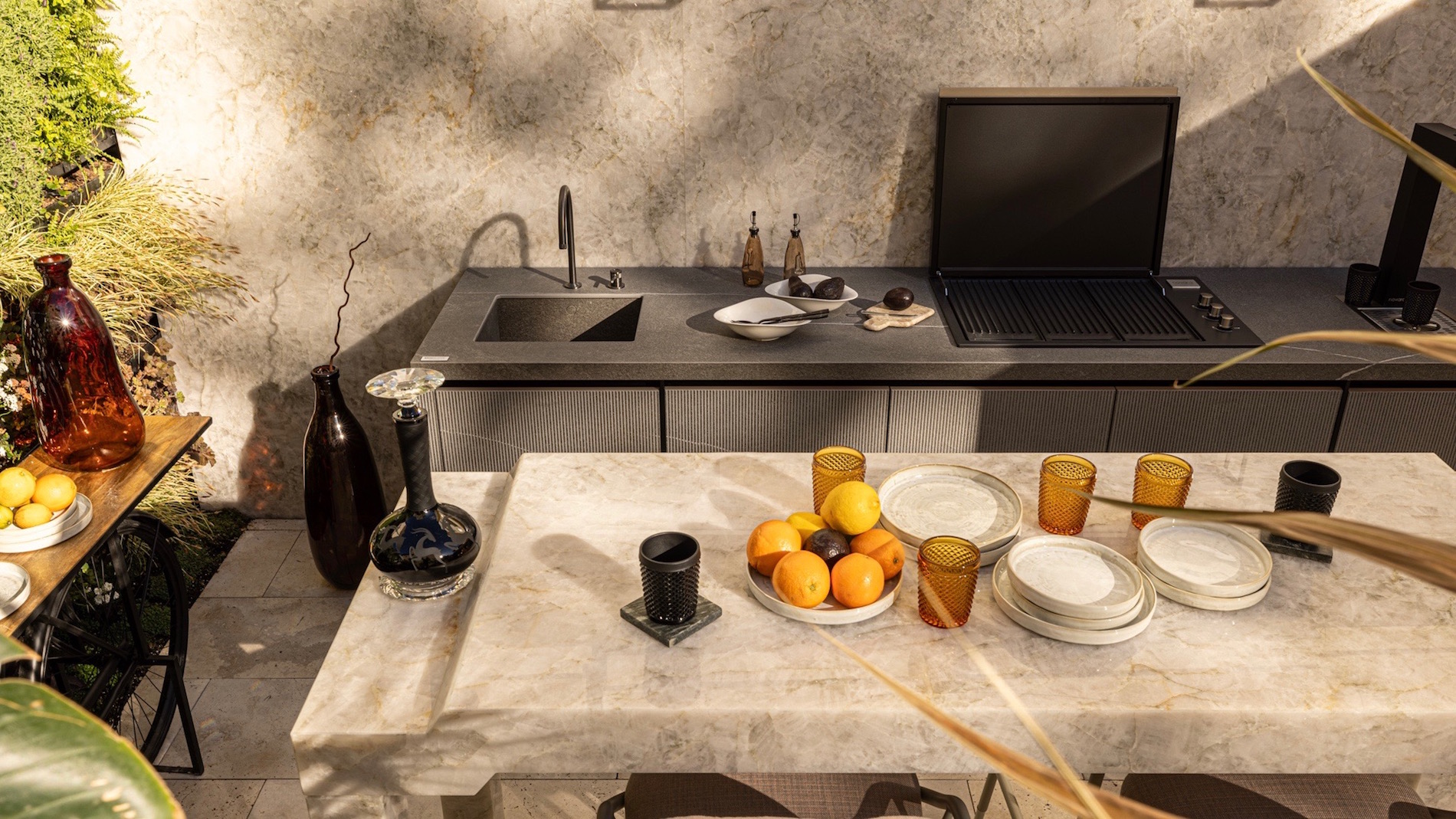 Due cucine da esterni sono state progttate da due importanti studi di architettura: il materiale Luna Limestone è stato scelto per Espacio Euromobil, “In/Out Kitchen” (progettato da Dosde) per il top della cucina e le ante degli armadi, con un’isola centrale che si estende verso l’esterno. Il piano da 12 mm diventa un bar all’aperto, perfetto per la preparazione dei pasti en plein air. .