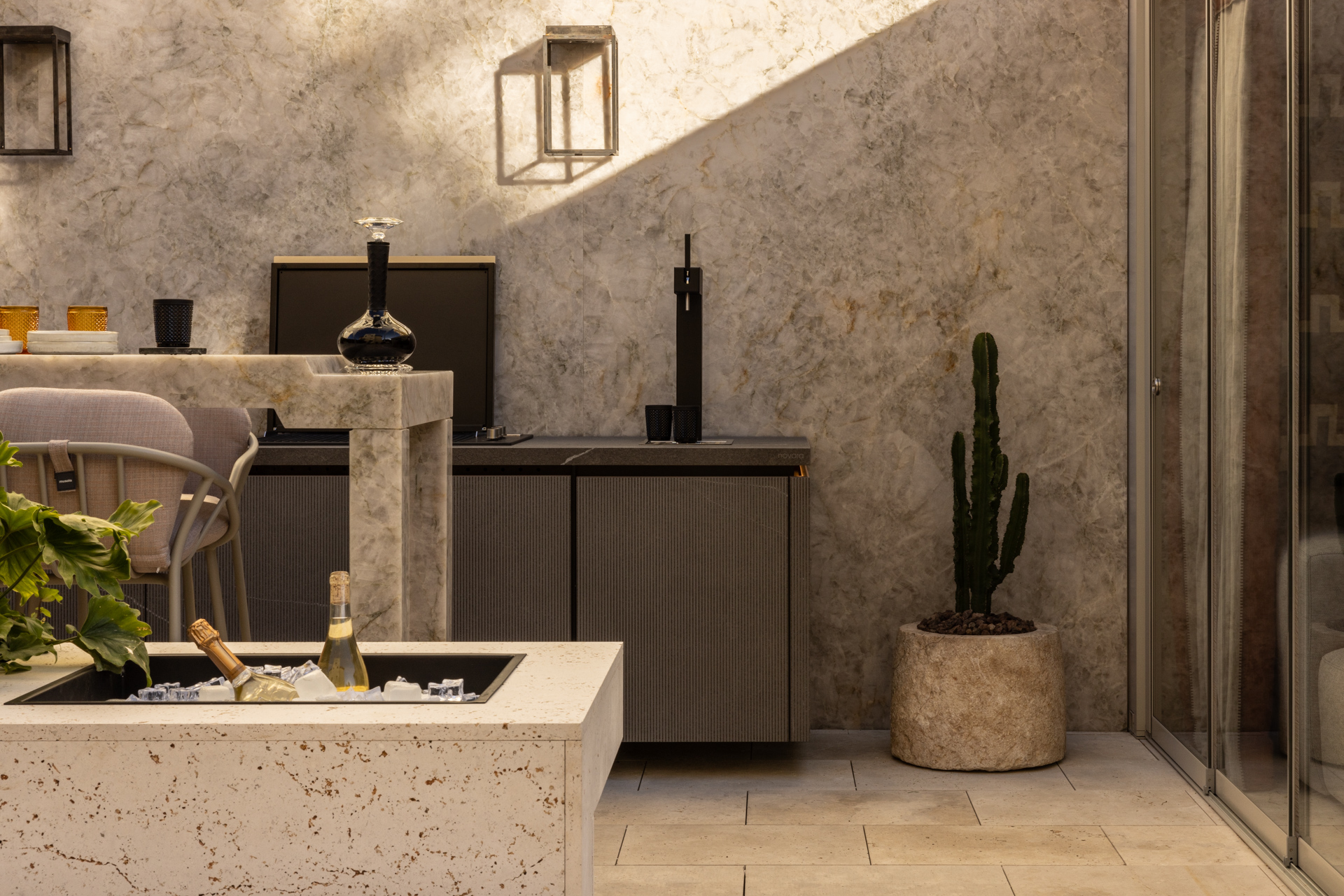 Piasentina invece è stata selezionata per Spazio Xaza (progttato da Raquel Chamorro) per una cucina all’aperto in uno spazio che include anche un solarium con piscina, un giardino verticale e una zona chill-out. Con spessori da 6 e 12 mm, Piasentina abbina resistenza e bellezza naturale, creando un ambiente outdoor esclusivo e accogliente.