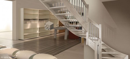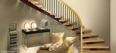 Si tratta di una scala a giorno con mono struttura portante in metallo, gradino in legno, colonna in metallo cilindrica, caposcala in legno a sezione rettangolare, corrimano in legno a sezione rettangolare. I componenti in legno sono in faggio lamellare. È possibile avere come optional l’alzata chiusa tra i gradini, la balaustra a protezione foro botola, l’invito sul primo gradino che permette di migliorare l’ingresso e l’uscita della scala, i piedi di appoggio a terra (in caso non ci fossero muri portanti sono necessari). Verniciatura delle parti in metallo eseguita mediante polveri epossidiche e poliuretaniche, verniciatura delle parti in legno eseguita mediante vernici all’acqua. Questo modello è esclusivamente per interni.