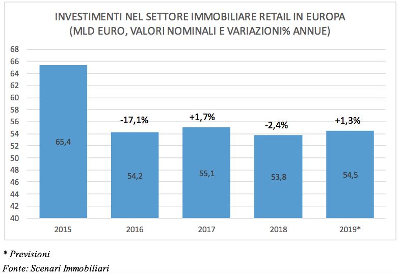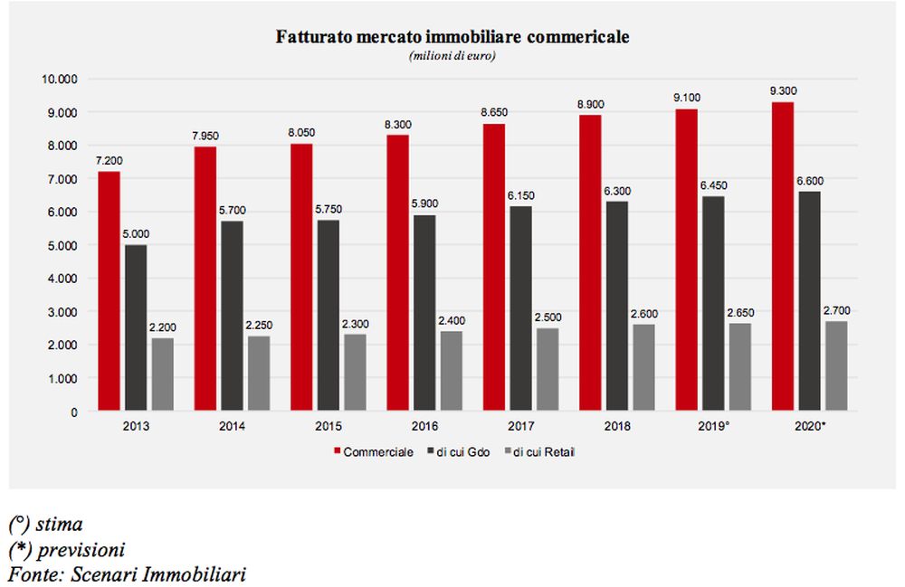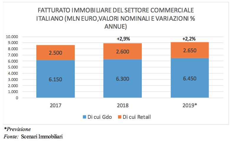In Italia il fatturato immobiliare del settore commerciale nel 2018 ha raggiunto 8,9 miliardi di euro, che dovrebbero salire a 9,3 nel 2020.