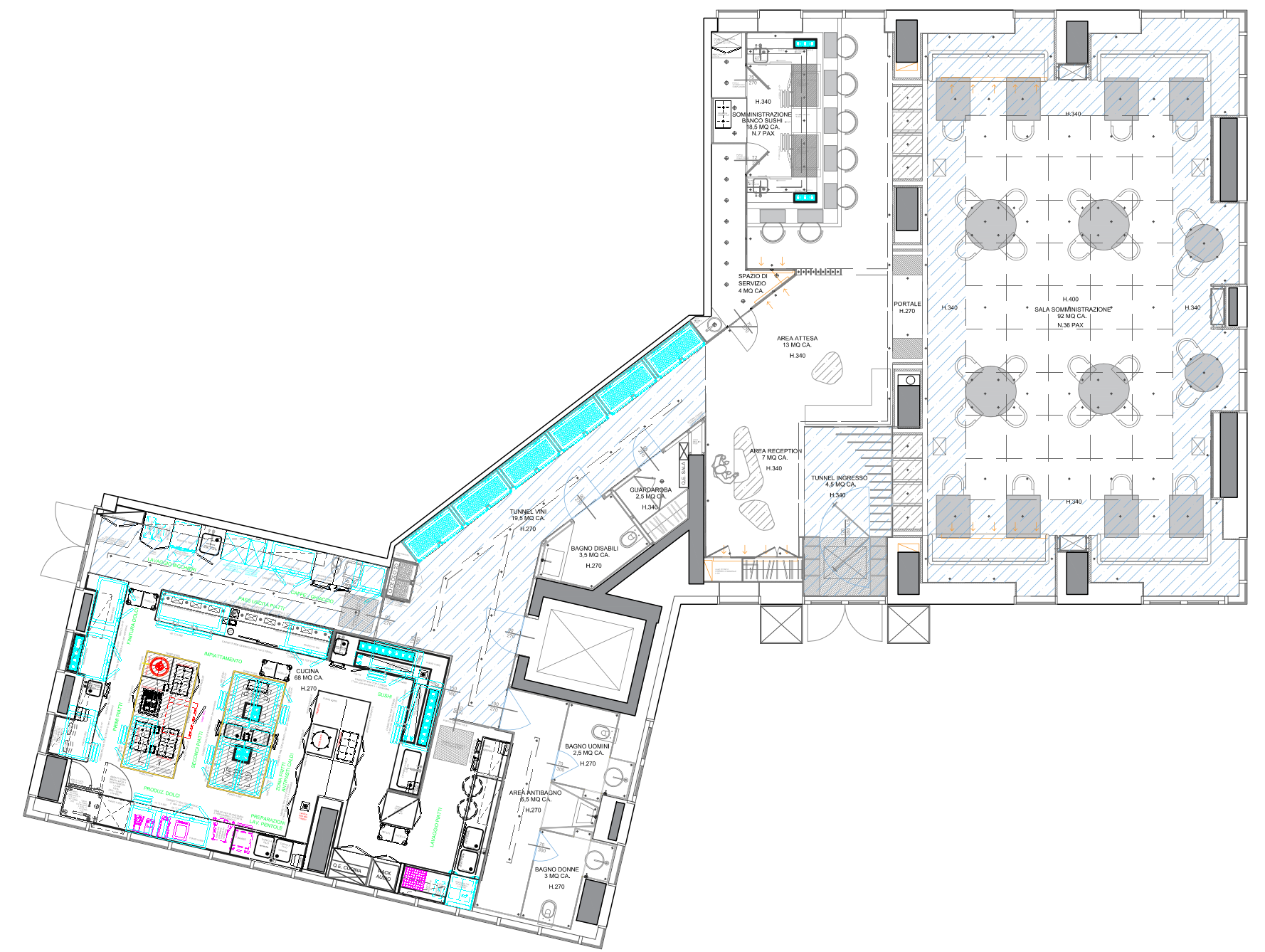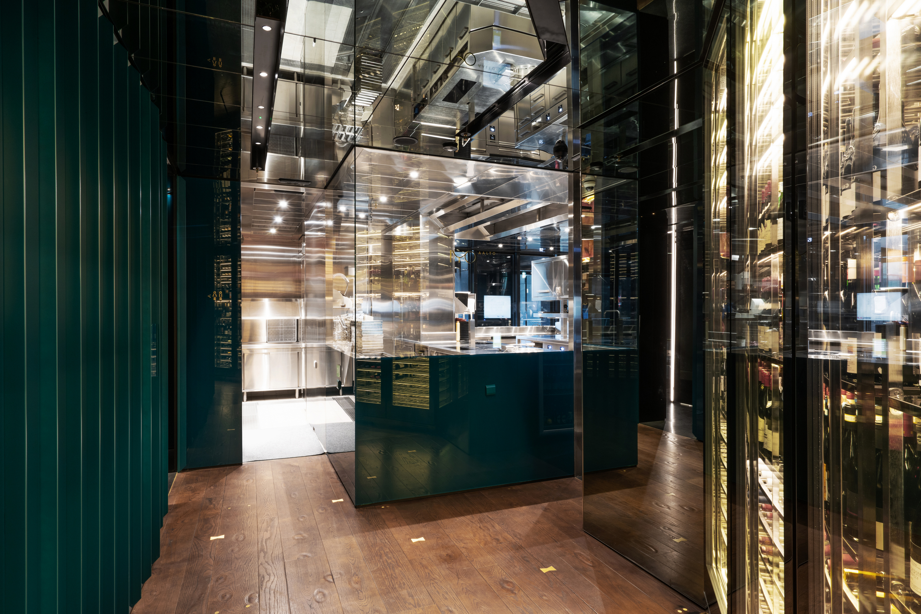 Lo spazio Aalto Part Of Iyo rientra nella categoria dei ristoranti che puntano tutto sul binomio perfetto tra cucina di alta qualità e interni unici, esclusivi, taylor-made. Si sviluppa su una superficie considerevole: 320 metri quadri suddivisi in due ambienti principali, il Sushi Banco, che riproduce per pochi intimi in diretta la magia della cucina edomae zushi di Tokyo e il ristorante gastronomico con la tradizionale distribuzione e il servizio ai tavoli. La grande cucina a vista e la cantina dei vini sono gli altri due spazi protagonisti. All’ampia zona dedicata alla consumazione del cibo si contrappone l’area dedicata alla preparazione, collegata da un “tunnel” luminoso dove spicca la grande parete contenitore con le bottiglie a vista. Anche i servizi, di dimensioni contenute, sono progettati per restituire un’immagine psichedelica di forte impatto grazie all’impiego di materiali di rivestimento riflettenti e di sculture luminose.