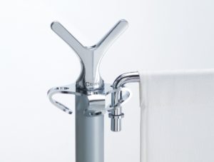 Le basi in acciaio e i montanti in tondino d’acciaio verniciato con polveri epossidiche, sono disponibili nelle finiture bianco opaco o grigio argento.