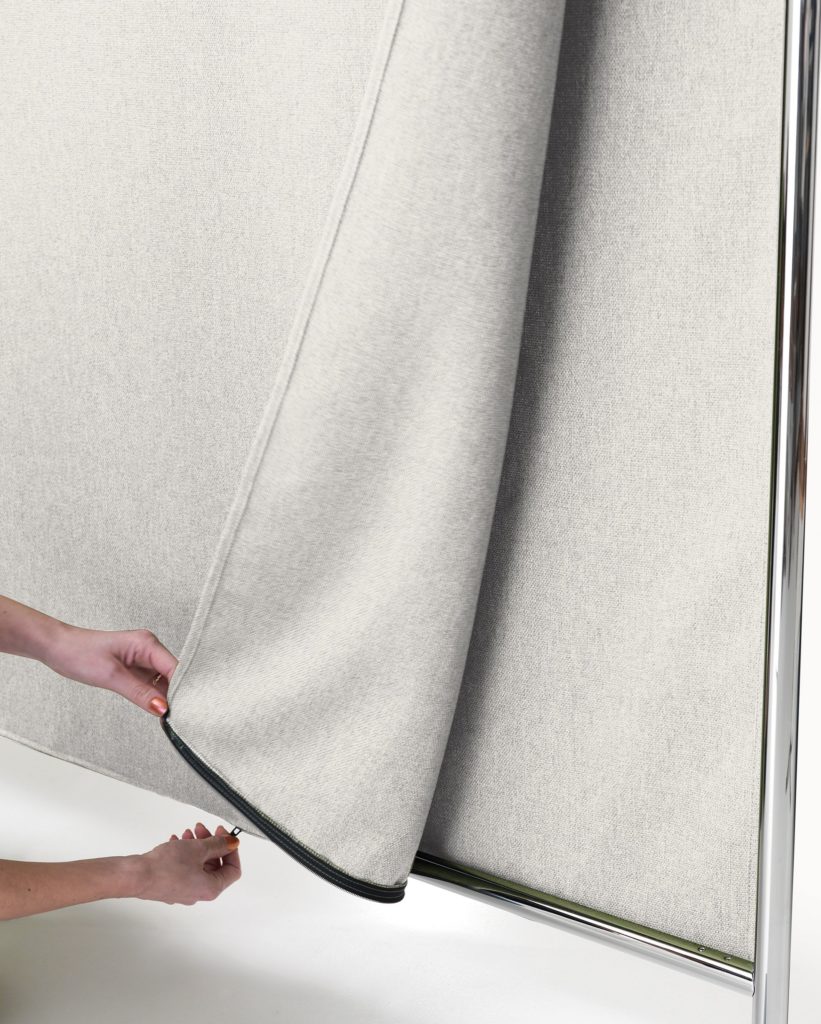 Divisori fonoassorbenti disegnati da Sezgin Aksu e realizzati con teli in tessuto Snowsound Fiber 1 batteriostatico, facilmente rimovibili per il lavaggio. Strutture in tubolare di acciaio cromato montate su una sola base che permette di accostare più divisori in linea o ad angolo. La base, sempre in tubolare, è dotata di ruote poste alle estremità che ne consentono il facile spostamento.