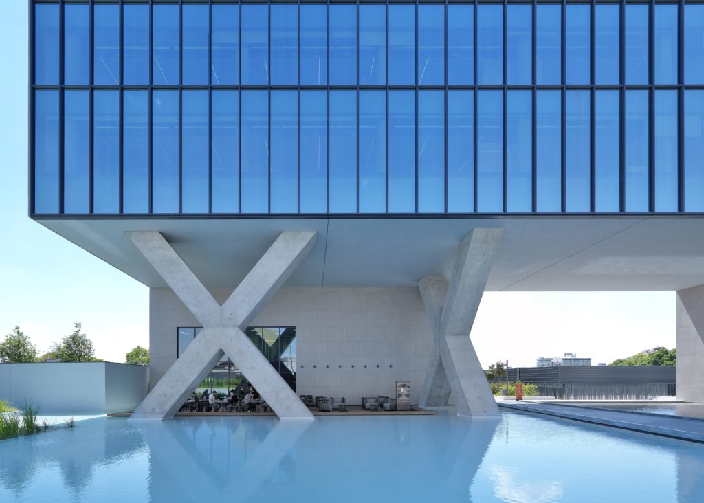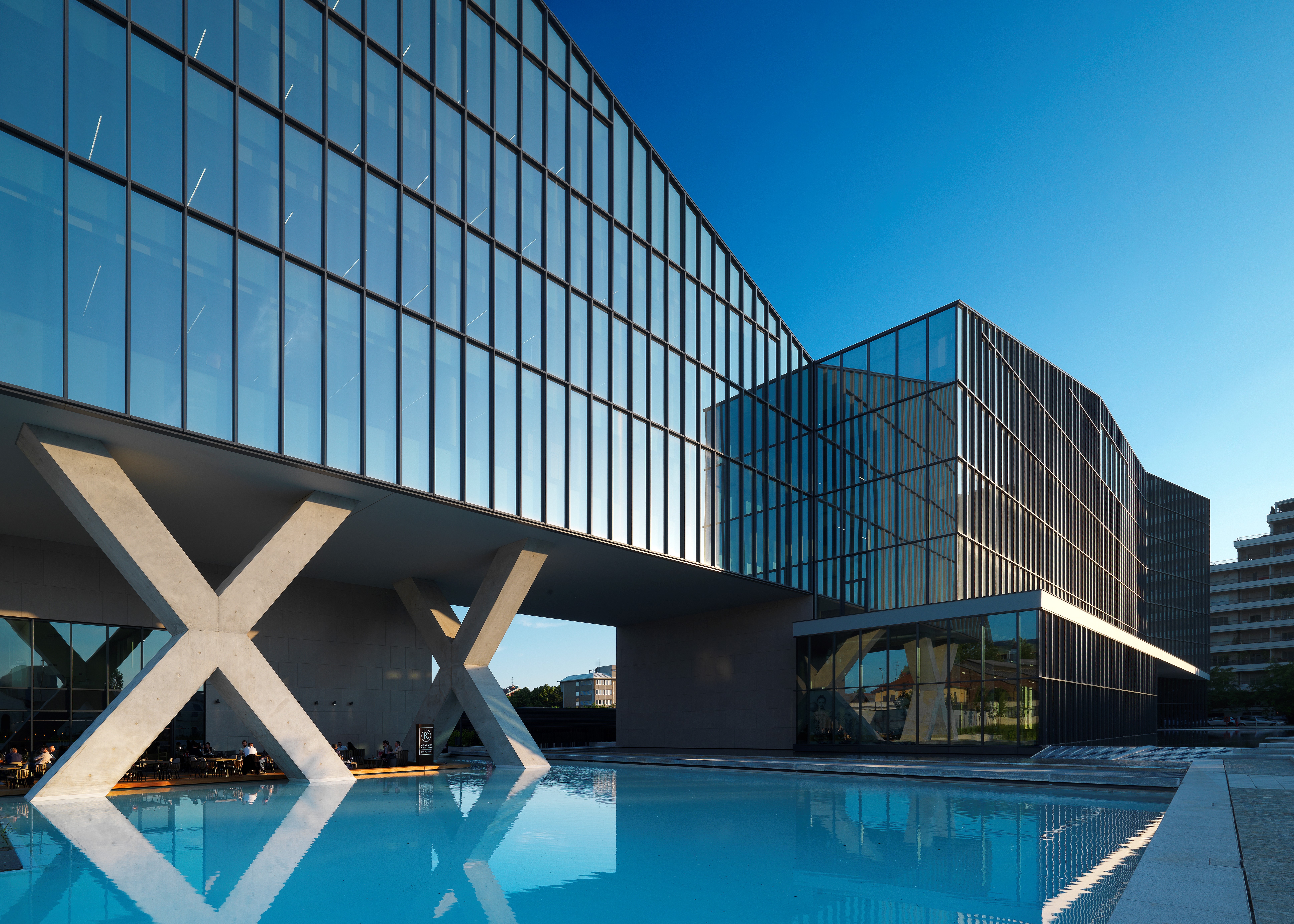 Per accentuare il senso di continuità tra ambienti interni e paesaggio nonché rispondere a specifici criteri di sostenibilità, efficienza ed eccellenza tecnologica, le grandi specchiature che caratterizzano questa facciata sono state realizzate ad hoc da Schüco con uno speciale sistema a cellule in cui ogni singola partizione vetrata misura 1350×3900 mm. Le dimensioni dei moduli, già di per sé notevoli, aumentano ulteriormente al secondo piano in corrispondenza del ponte sorretto dalle strutture in cemento armato a forma di “X”, dove si estendono nella parte inferiore – raggiungendo un’altezza di 6000 mm – per ricoprire la struttura in acciaio che determina lo sbalzo dell’edificio.