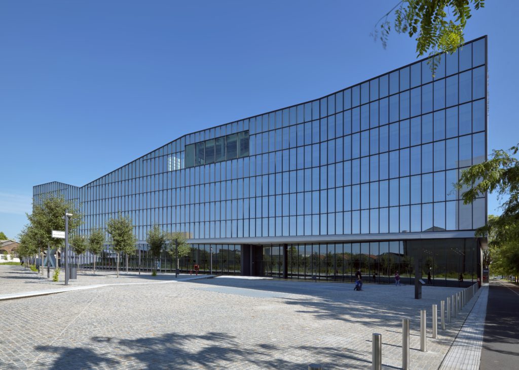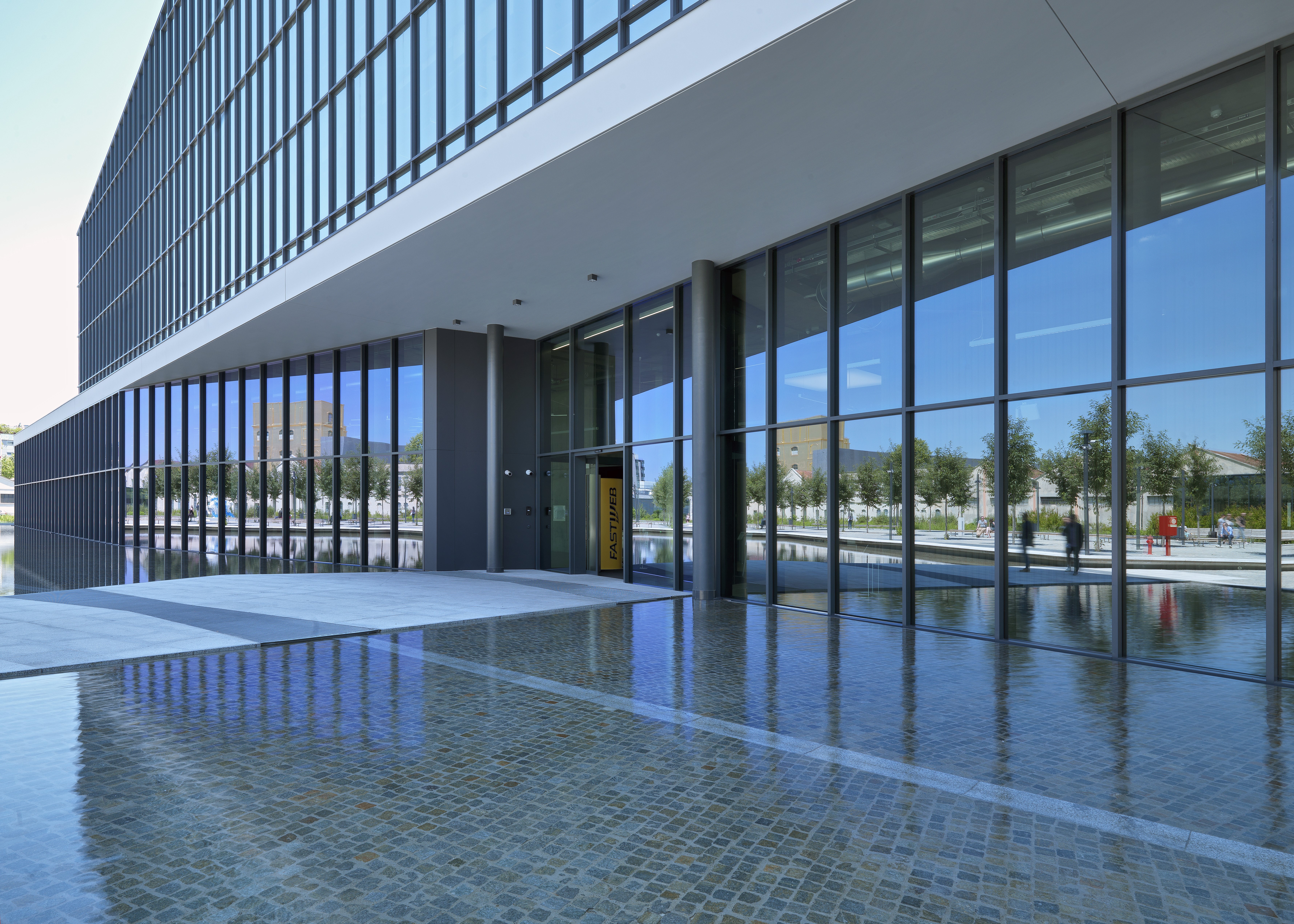 La prima struttura terminata è l’headquarter Fastweb che è destinata alle attività amministrative e commerciali. L’intera superficie, di circa 19.000 m2, è distribuita in un corpo con pianta a “L” orientato prevalentemente in direzione est-ovest. I prospetti meridionali e laterali presentano una trama scandita da finestrature in alluminio regolari rientranti rispetto al rivestimento in gres. Realizzate da Schüco in una variante customizzata, sono formate da gruppi di tre serramenti non apribili (delle dimensioni di 1350×2700 mm ciascuno) affiancati a un tamponamento opaco.
