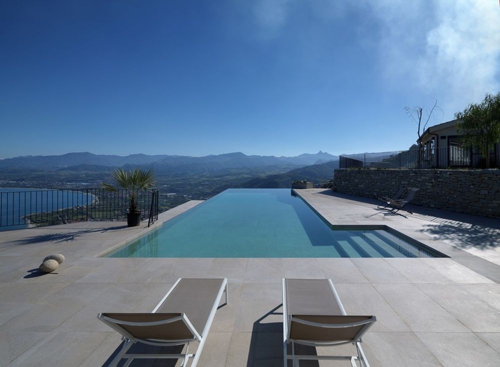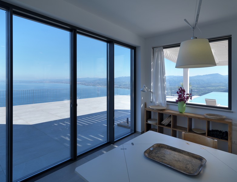 Spazi fluidi e trasparenti con una suggestiva vista che spazia dalle Isole Eolie al Golfo di Milazzo, fino alle cime dei Monti Peloritani: la Villa Dionisio si trova a Tindari, in provincia di Messina, immersa nel blu del Mediterraneo ed è un edificio semplice ma lussuoso, con ampie vetrate rivolte su panorami spettacolari e massima continuità fra interno ed esterno. Per le aperture scelti i sistemi in alluminio Schüco.