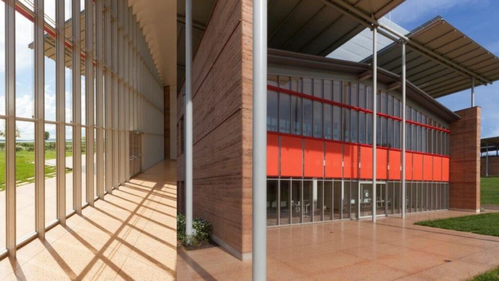 Resstende si è occupata di fornire le tende esterne a rullo, scelte nello stesso colore della terra pisè così da uniformarsi con il progetto. I vetri delle facciate e dei serramenti sono di AGC, mentre di Pellinindustrie sono le veneziane interno vetro integrate nei serramenti della struttura. Infine Schneider Electric si è occupata di ottimizzare i sistemi di energia grazie ai quadri elettrici così da garantire la continuità nell’erogazione della corrente elettrica in qualsiasi momento.