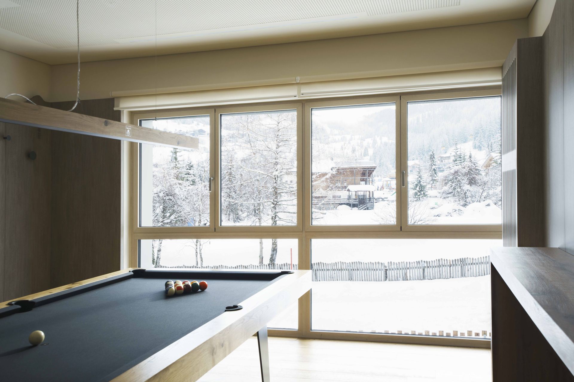 - grazie alle loro performance di isolamento termico, con valori Uf fino a 1,3 W/m2, i sistemi in alluminio Schüco AWS 75 BS.HI evitano la dispersione del calore (o del fresco a seconda delle stagioni) e contribuiscono a mantenere costante la temperatura interna, per un’elevata efficienza energetica. Fattore di fondamentale importanza in montagna, dove le spese per il riscaldamento di spazi di grandi dimensioni come questi possono essere ingenti.