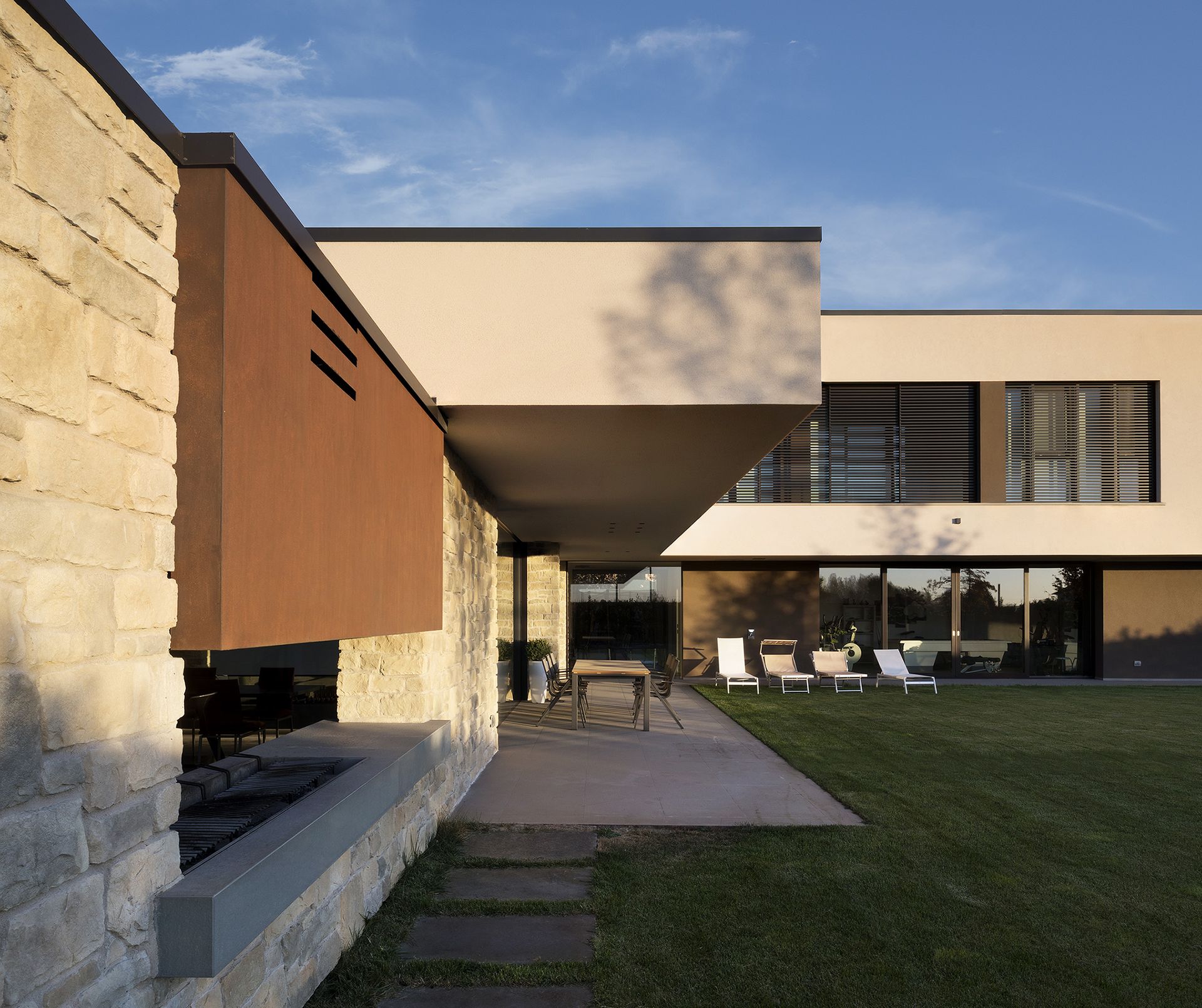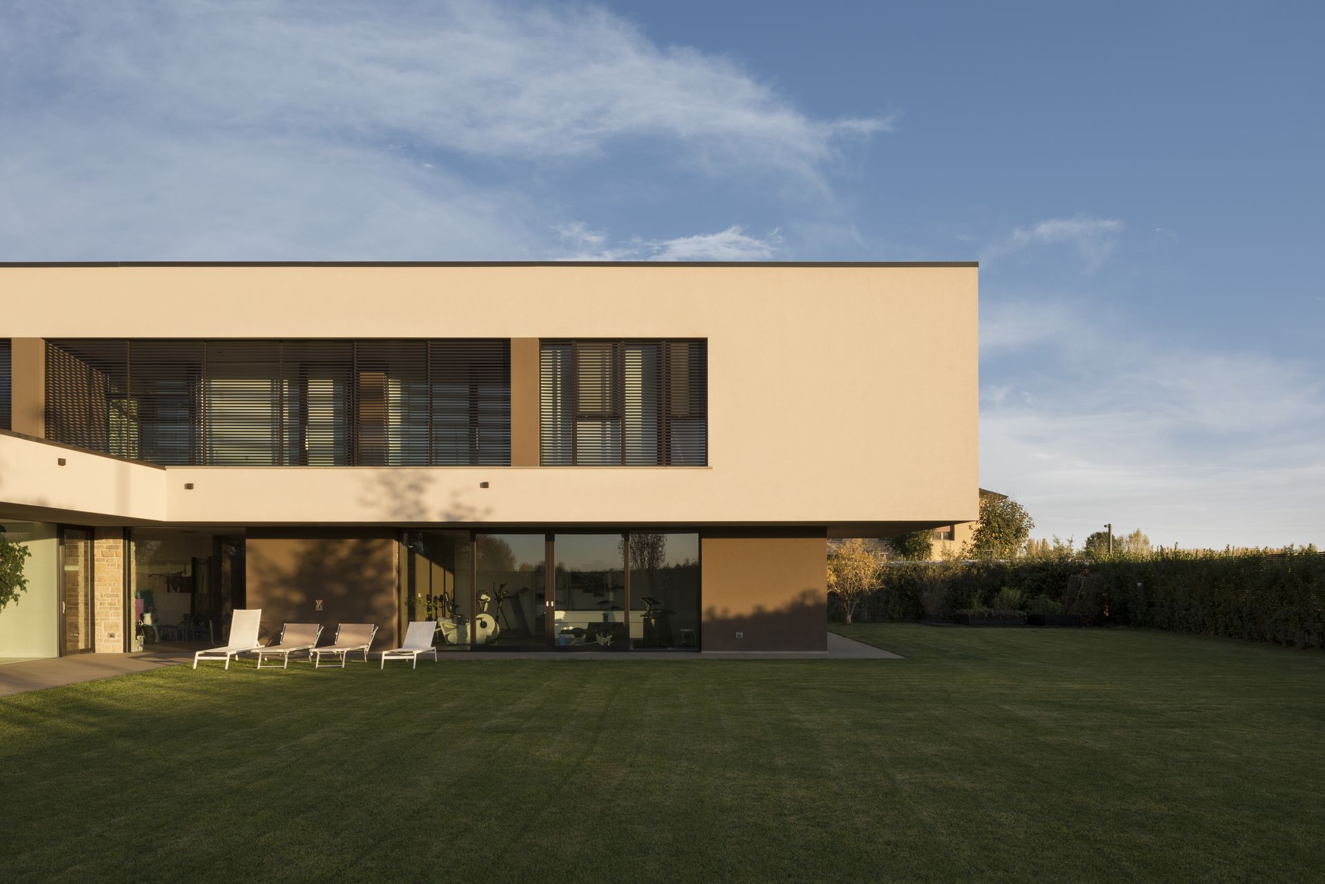 Il progetto architettonico di una residenza di campagna situata a Cento, vicino Ferrara, curato da Zsm Studio, trae ispirazione dal paesaggio regolare della pianura emiliana. Sorta sulle rovine di un antico casolare abbandonato, l’abitazione si caratterizza per l’estetica razionale e al tempo stesso sofisticata, basata sull’intersezione tra un blocco monopiano che ospita la zona giorno e un volume su due livelli destinato ai locali accessori e alle camere da letto.