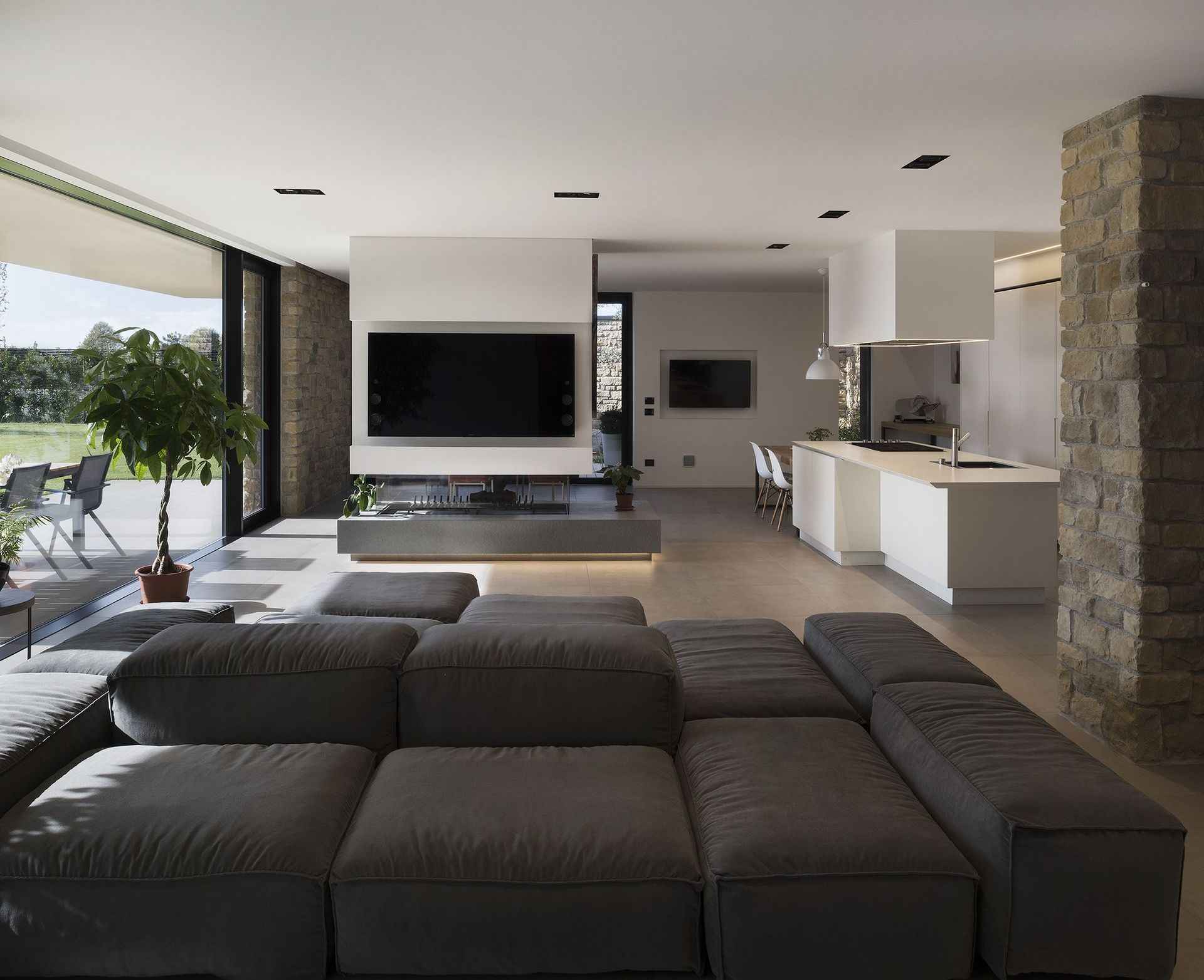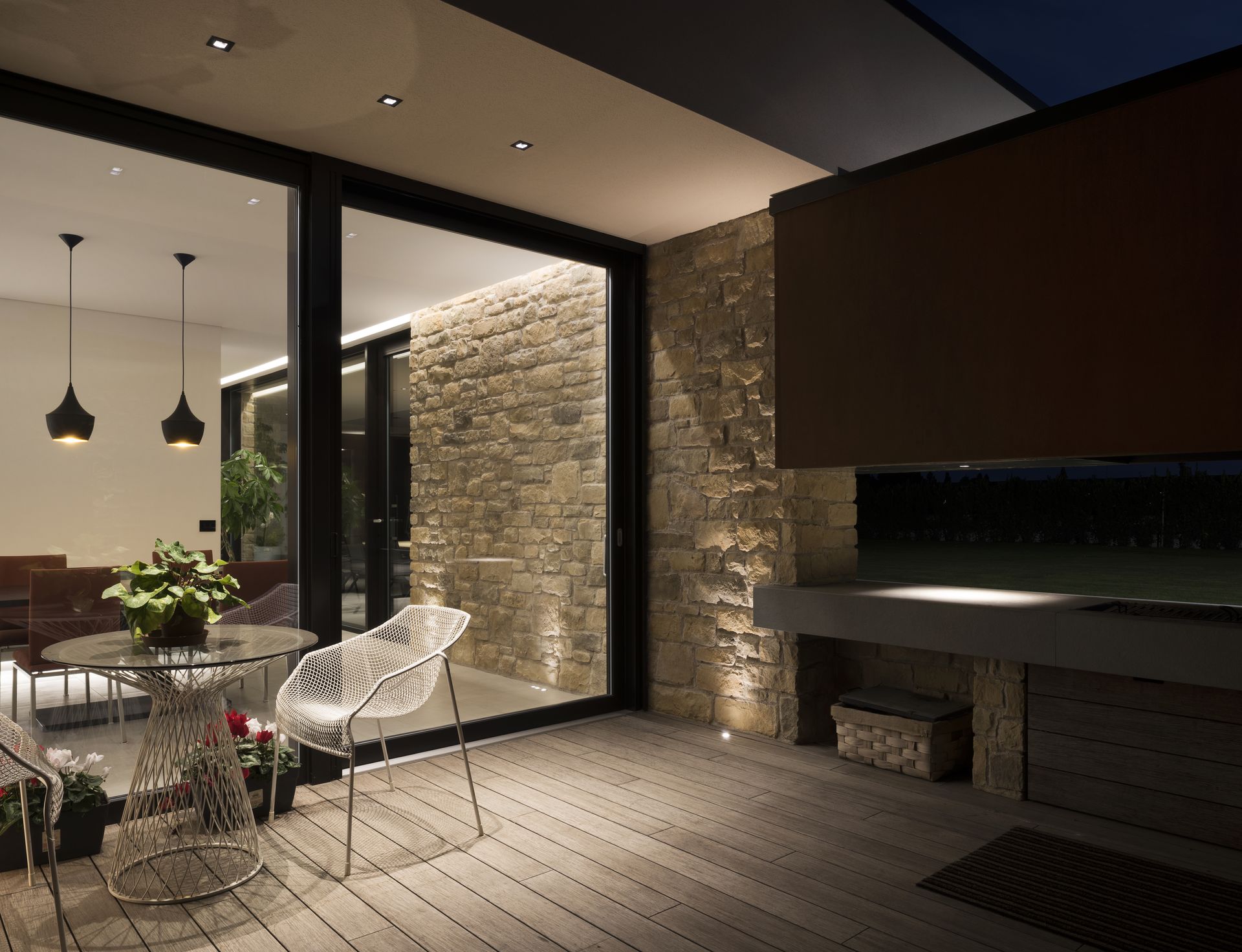 I grandi scorrevoli che mettono in diretta comunicazione gli ambienti domestici con il giardino circostante sono stati realizzati con il sistema in alluminio Schüco ASS 70 HI(High Insulation). Le sue elevate prestazioni in termini di isolamento termico non solo hanno consentito di ridurre l’impatto energetico dell’edificio, grazie a un notevole risparmio sui costi di riscaldamento e raffrescamento, ma hanno incrementato anche il comfort indoor, regalando una migliore abitabilità della casa fino a ridosso degli infissi, senza i fastidiosi sbalzi termici tipici delle aree vicino alle vetrate.