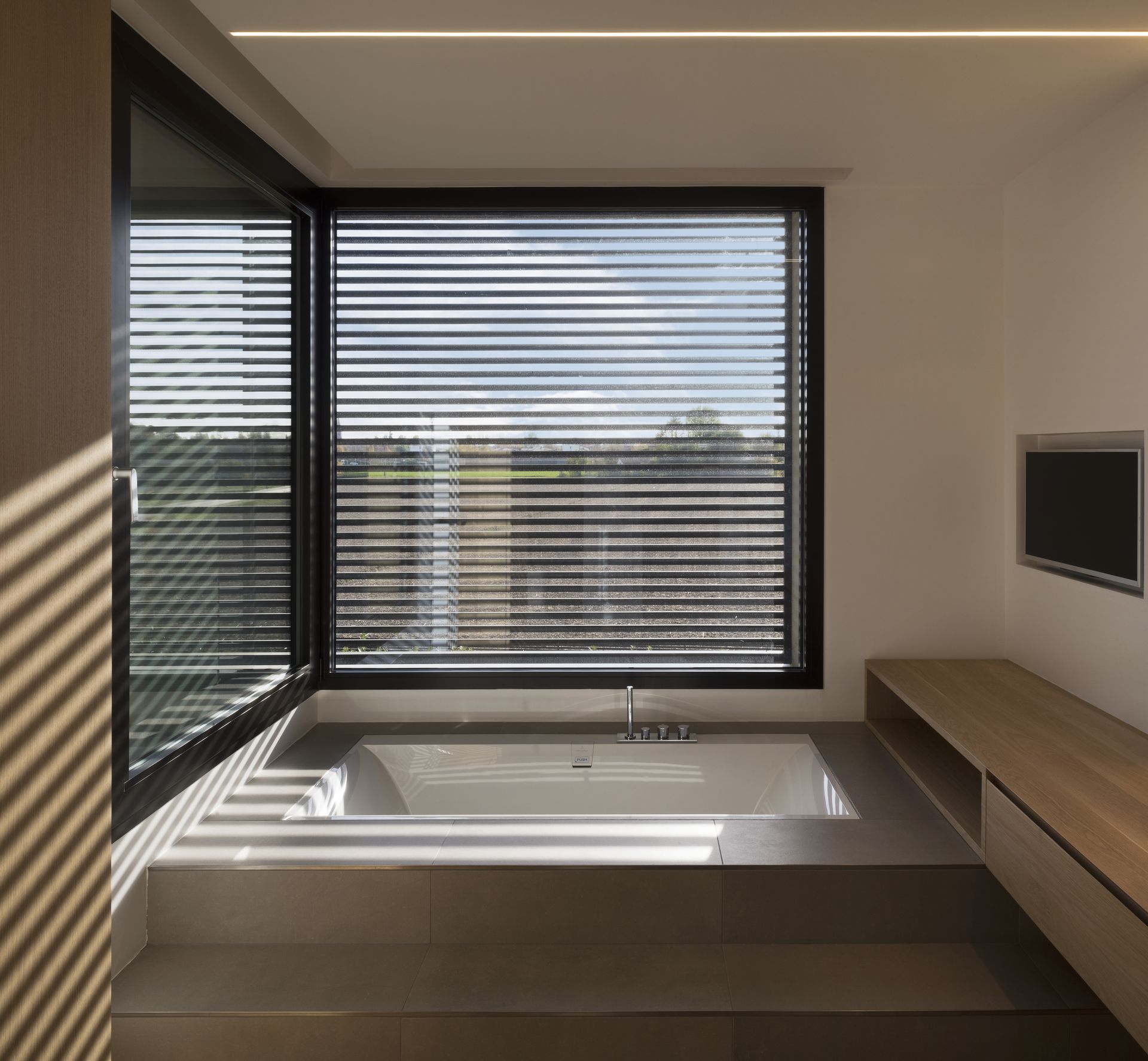Per le finestre e le porte finestre, invece, è stato scelto il sistema in alluminio Schüco AWS 75 SI (Super Insulation), i cui speciali profili garantiscono un’elevata tenuta agli agenti atmosferici e rallentano i flussi termici dall’esterno all’interno e viceversa, preservando la temperatura indoor e ostacolando la formazione di condensa sull’infisso. Tale caratteristica si è rivelata utile soprattutto per le finestre di grandi dimensioni del bagno padronale, in cui la vasca è sormontata da un doppio serramento quadrato.