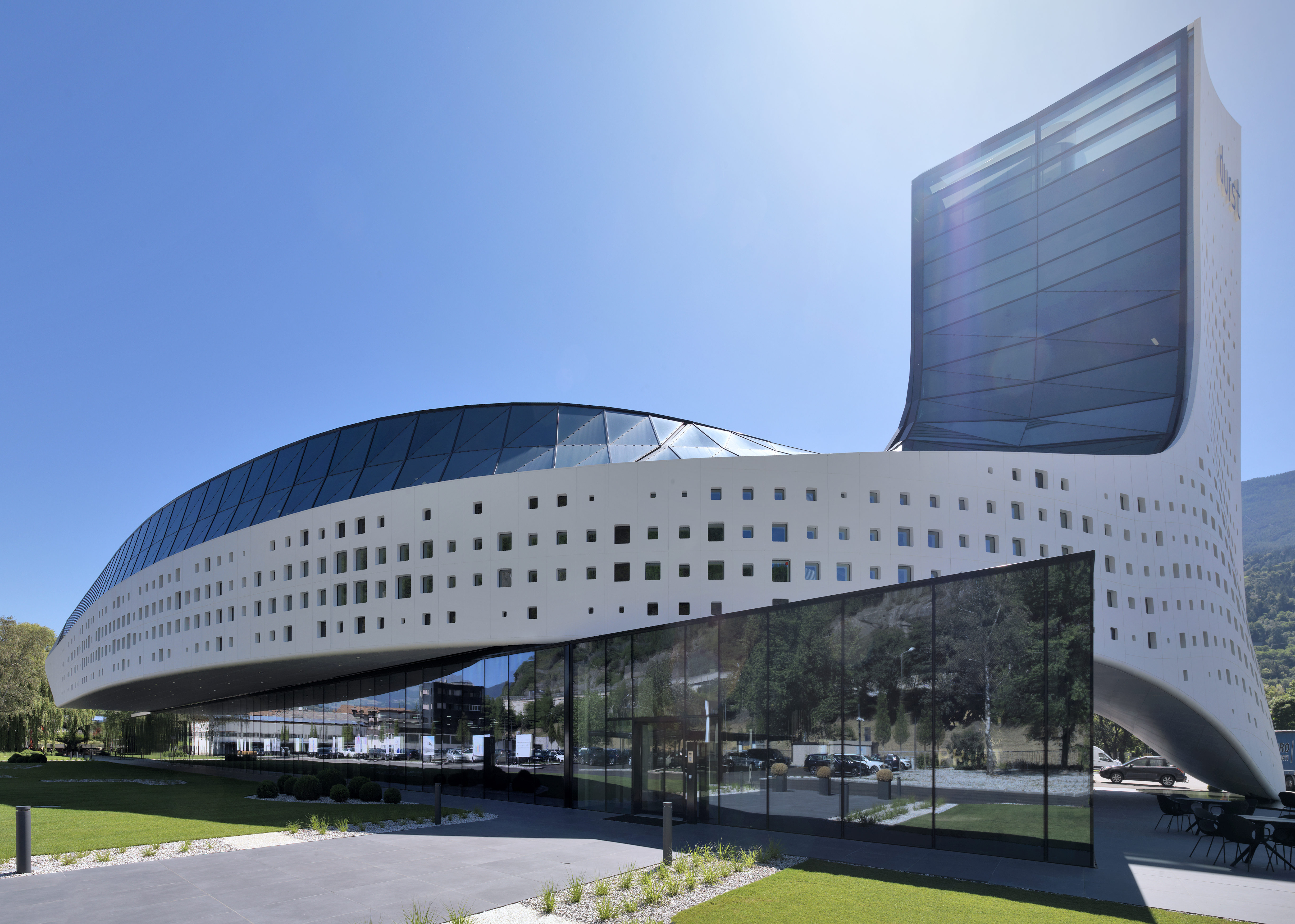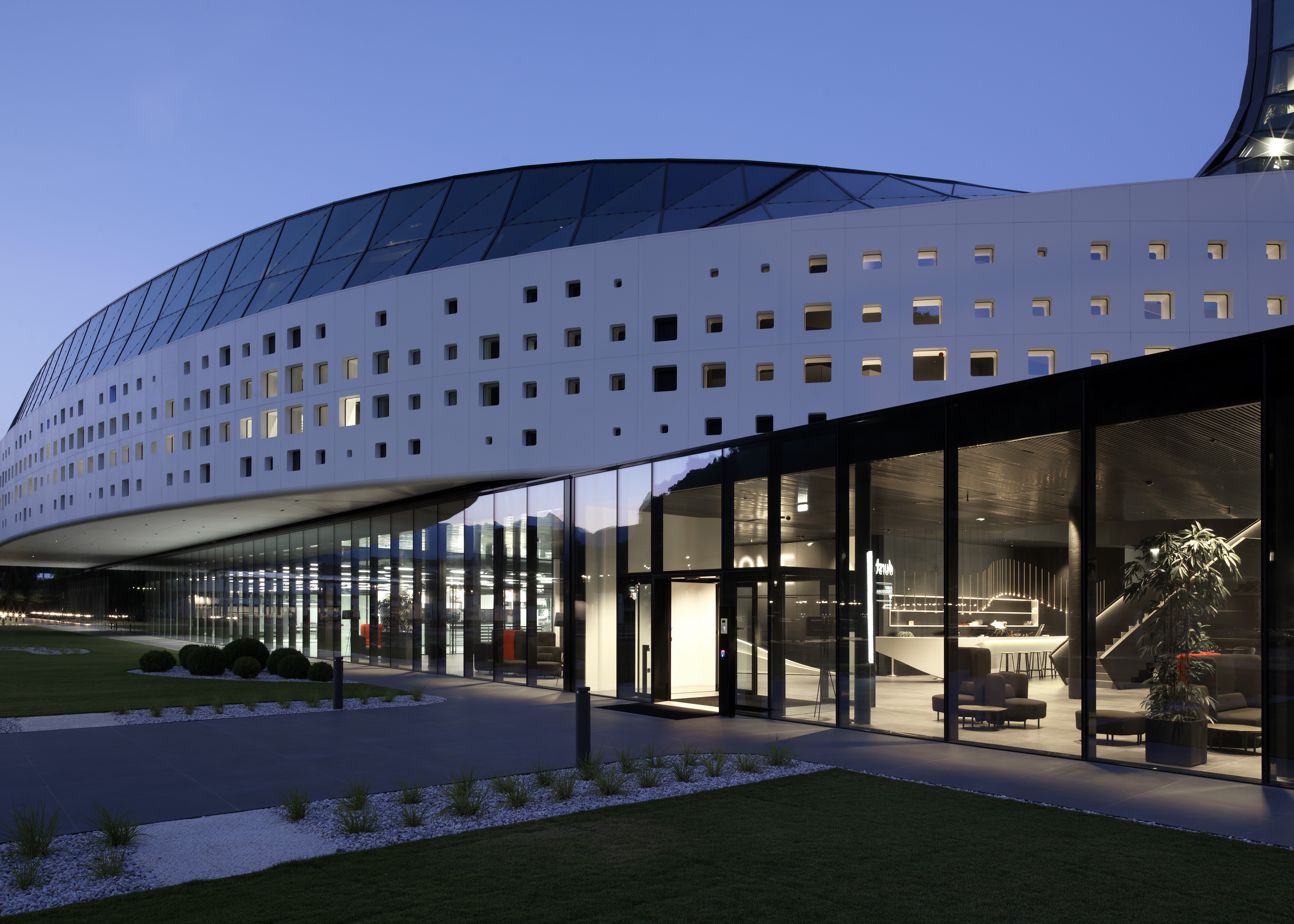 Articolato prevalentemente su due sezioni sovrapposte di forma allungata e compatta, l’involucro architettonico stupisce per libertà espressiva ed eccellenza costruttiva: in prossimità dell’ingresso allo stabilimento, la composizione si innalza in verticale con una torre dalla silhouette morbida e leggera.