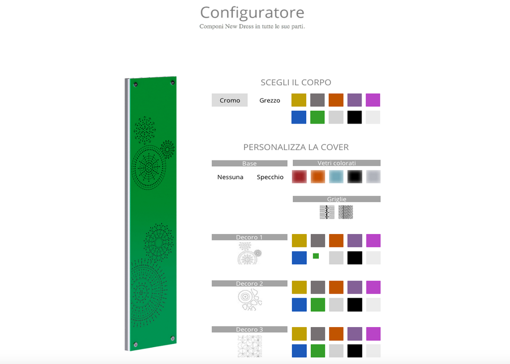 Il sito web non è solo una vetrina ma soprattutto un configuratore 3D online con il quale, in pochi click, creare il proprio radiatore personalizzato. L’idea è quella di fornire un valido strumento che possa far apprezzare in anteprima il risultato finale dell’abbinamento tra corpo scaldante e cover, lasciando libero l’utente di “mixare” tra loro stili e colori differenti in base al proprio stile o a quello della stanza in cui viene installato. Le scelte sono quasi infinite, si parte dal classico corpo scaldante cromato, passando per quello colorato (65 tonalità in fase di implementazione), fino ad arrivare alla speciale finitura “ferro grezzo”, dall’inconfondibile look industriale. Una volta definita la struttura è il momento di scegliere la cover preferita: al vetro temprato colorato e inox specchio lucido si affiancano le nuove lastre in lamiera d’acciao microforellinata e le esclusive lastre in tela metallica con profilo in acciaio inox lucido nei modelli “Spiga” e “Crimpy”. La pagina, in versione bilingue italiano e inglese, è stata creata con le ultime tecnologie responsive che permettono di poterla utilizzare da pc, mac, notebook nonché da qualsiasi tablet (schermo in orizzontale).
