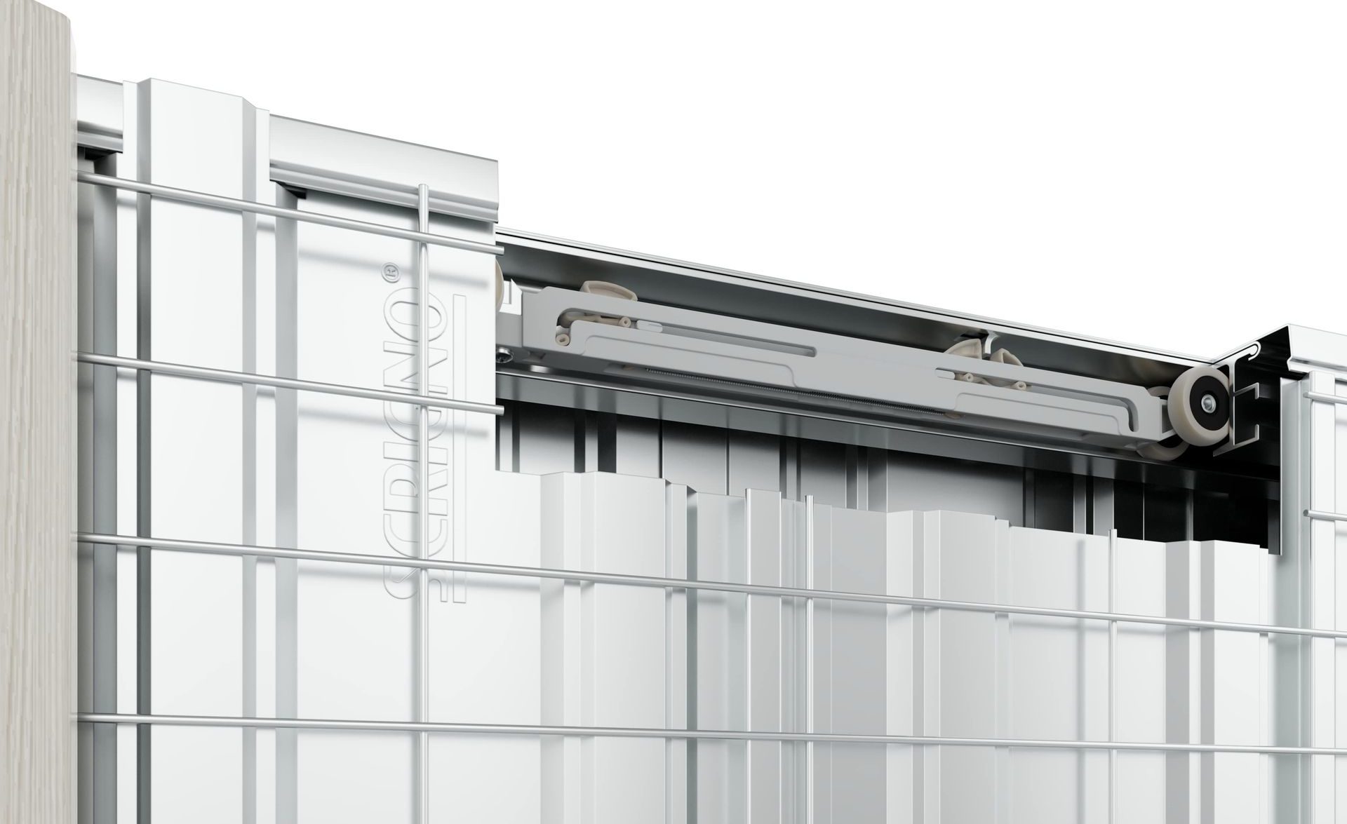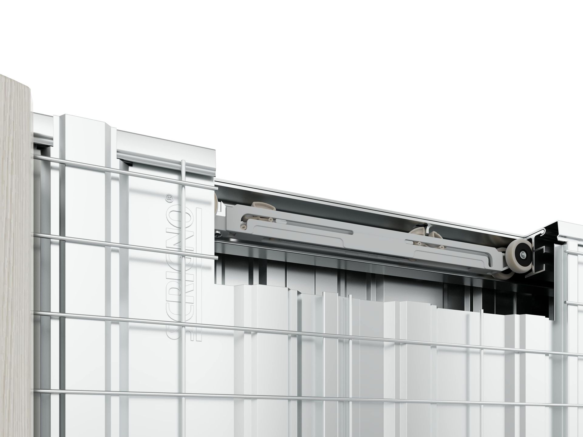 Gold è oggi dotato di una guida di scorrimento e di un carrello ridisegnati e predisposti per l’installazione di questo ammortizzatore, in grado di rallentare la porta sia in fase di apertura sia di chiusura.