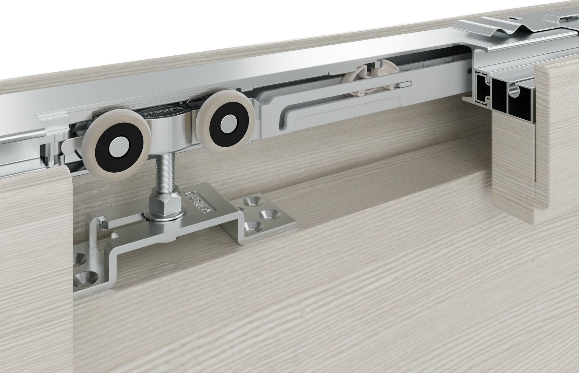 Il sistema Doppio Freno garantisce lo scorrimento ed accostamento ottimale di pannelli porta del peso massimo di 30 kg, riducendo ai minimi termini la forza necessaria per consentire lo sblocco dal sistema di ritenzione durante la chiusura.