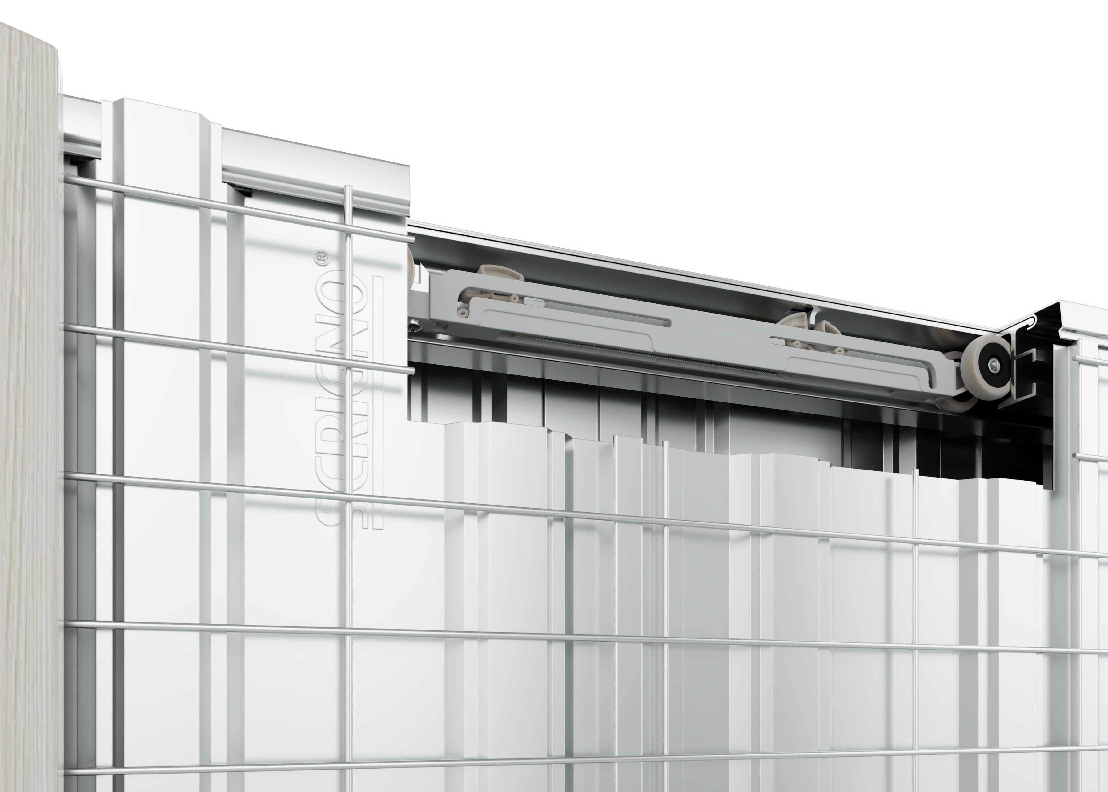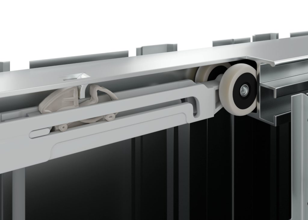 Tradizione e innovazione si incontrano in Gold, che si modella per accogliere il cambiamento, rimanendo immutato nella sua essenza. Il carrello, riprogettato quest’anno, conserva le medesime caratteristiche che l’hanno reso elemento di spicco dell’offerta Scrigno: realizzato con un corpo in metallo, prevede quattro ruote in Teflon, dotate ciascuna di un cuscinetto a sfera con schermi di protezione, a garanzia della massima scorrevolezza e del minimo impedimento. La presenza di ruote sporgenti rispetto al corpo in acciaio consente, inoltre, una significativa riduzione del gioco laterale che, unitamente, alla riduzione del gioco verticale, assicurano uno scorrimento sempre rettilineo. Ulteriore tratto distintivo è la struttura del cassonetto, realizzata con fianchi modulari che consentono di assorbire le dilatazioni dovute all’unione di materiali diversi tra loro, come il cemento e l’acciaio, e che presentano una grecatura verticale a coda di rondine.