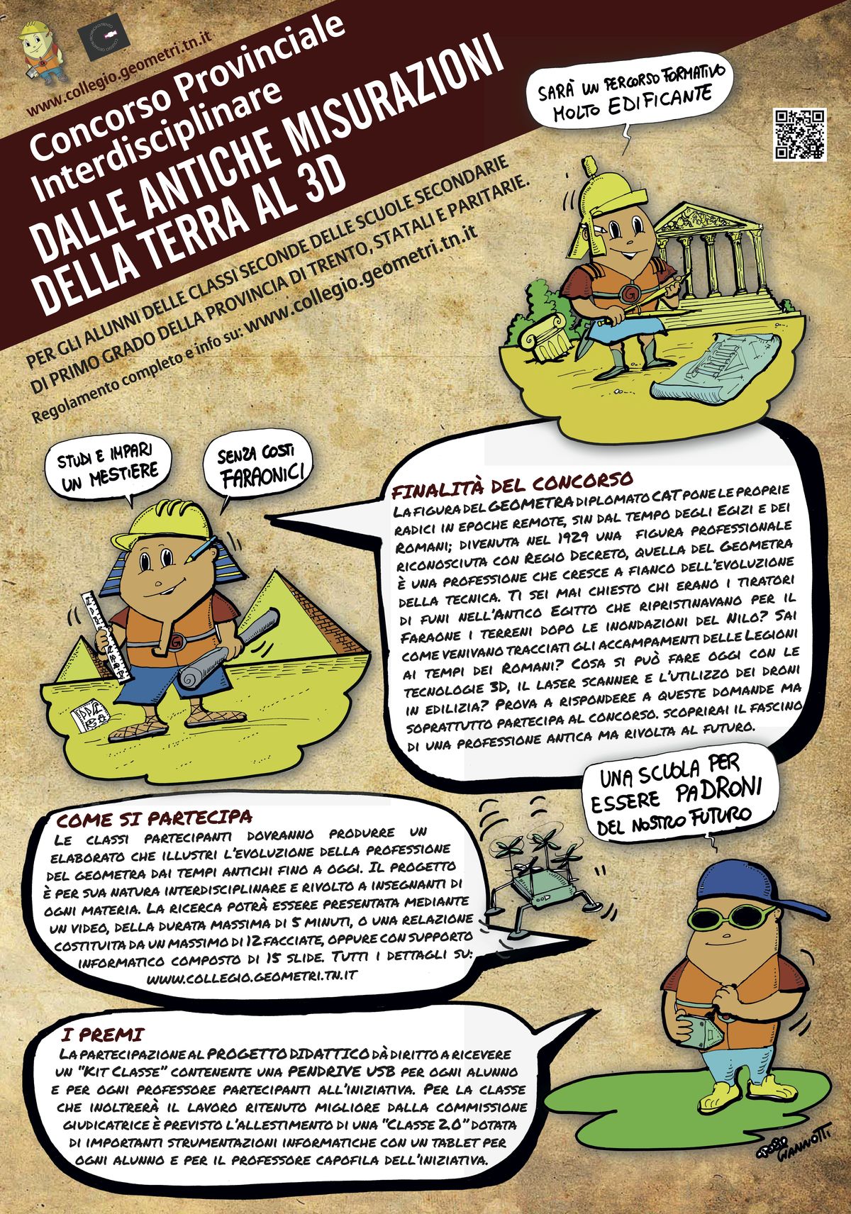«Dalle antiche misurazioni della terra al 3d» questo il tema del progetto didattico multidisciplinare a premi, rivolto alle classi seconde delle scuole secondarie di primo grado della Provincia autonoma di Trento promosso dal Consiglio del Collegio dei geometri della Provincia di Trento per l’anno scolastico 2016/2017.
