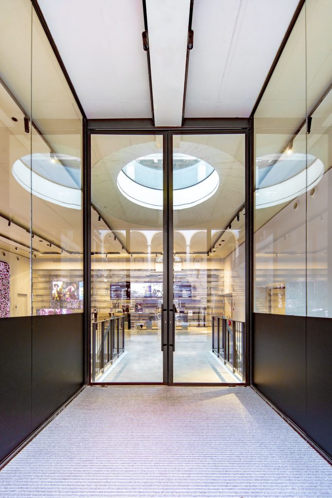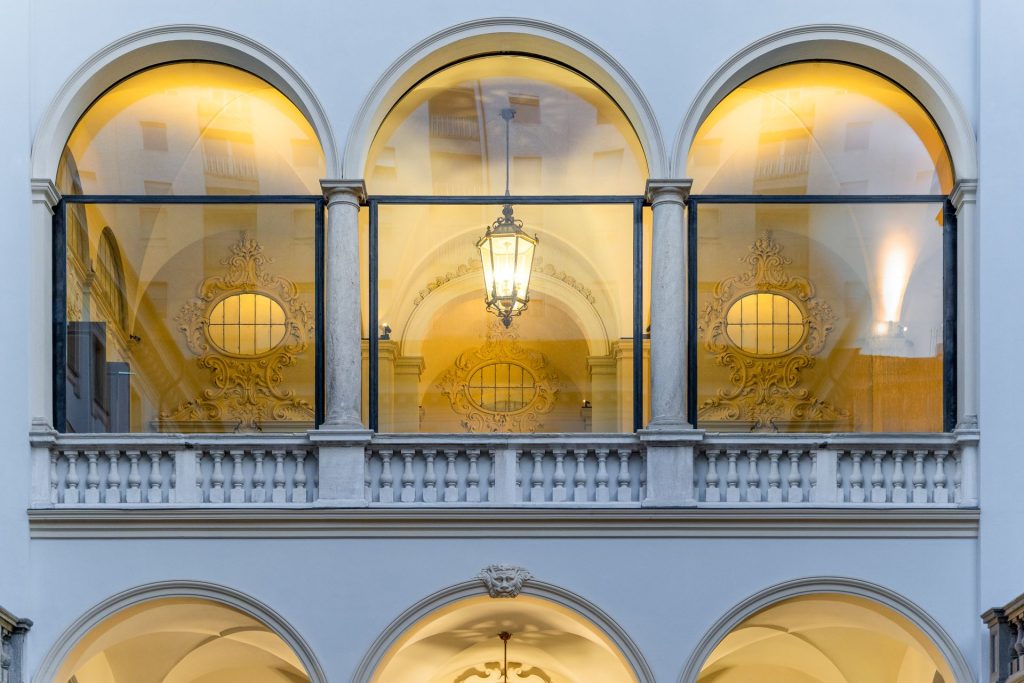 Le ampie vetrate a tutta altezza dell’ingresso e le aperture ad arco dei piani nobili reinterpretano il linguaggio classico del palazzo, offrendo una percezione di leggerezza e continuità visiva che amplifica l’interazione tra interno ed esterno.