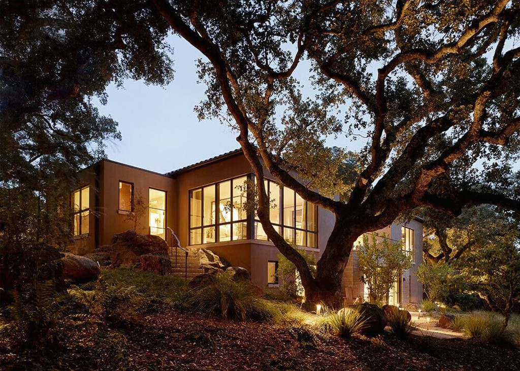 La villa tra gli alberi (Sonoma county, California), progetto di Ken Linstead Architects. La villa si inserisce armoniosamente all’interno del paesaggio coltivato a vigneti grazie all’utilizzo della pietra, del legno riciclato e a un linguaggio architettonico lineare e sobrio, messo in risalto dai serramenti metallici. Gli ampi elementi finestrati costruiti con il sistema OS2 di Secco Sistemi lasciano fluire luce e natura. La sottigliezza dei profili trasforma i serramenti in vere e proprie cornici che riquadrano il paesaggio circostante da ammirare nell’intimità della casa.