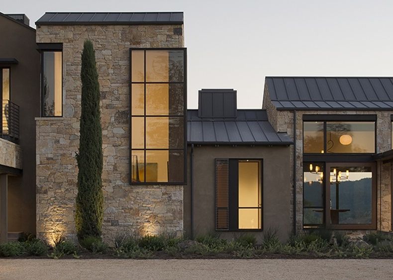 Geyserville Residence (Alexander Valley, Sonoma county in California), progetto di Moller Architecture. La residenza, situata in cima a una collina e circondata da querce, offre una vista panoramica sulle infinite distese di vigneti e sulle montagne costiere che si scorgono in lontananza. Le forme contemporanee dell’edificio sono abbinate alla pietra che si armonizza con i colori della natura circostante. La leggerezza estetica dei serramenti OS2 in acciaio zincato patinato nero offre la massima trasparenza e permette una comunicazione ideale tra interno ed esterno.