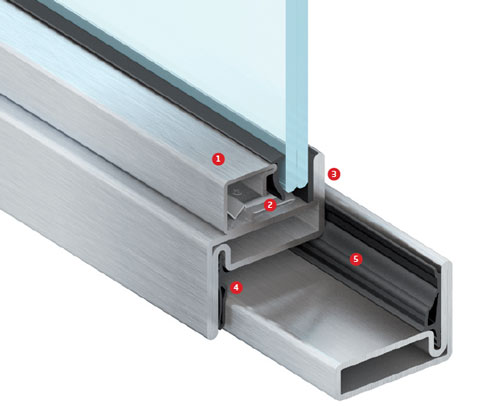 Secco Sistemi | 1 – fermavetro; 2 – camera di alloggiamento vetri fino a 28 mm; 3 – sormonto interno ed esterno; 4 – guarnizione di battuta interna; 5 – guarnizione di battuta esterna.