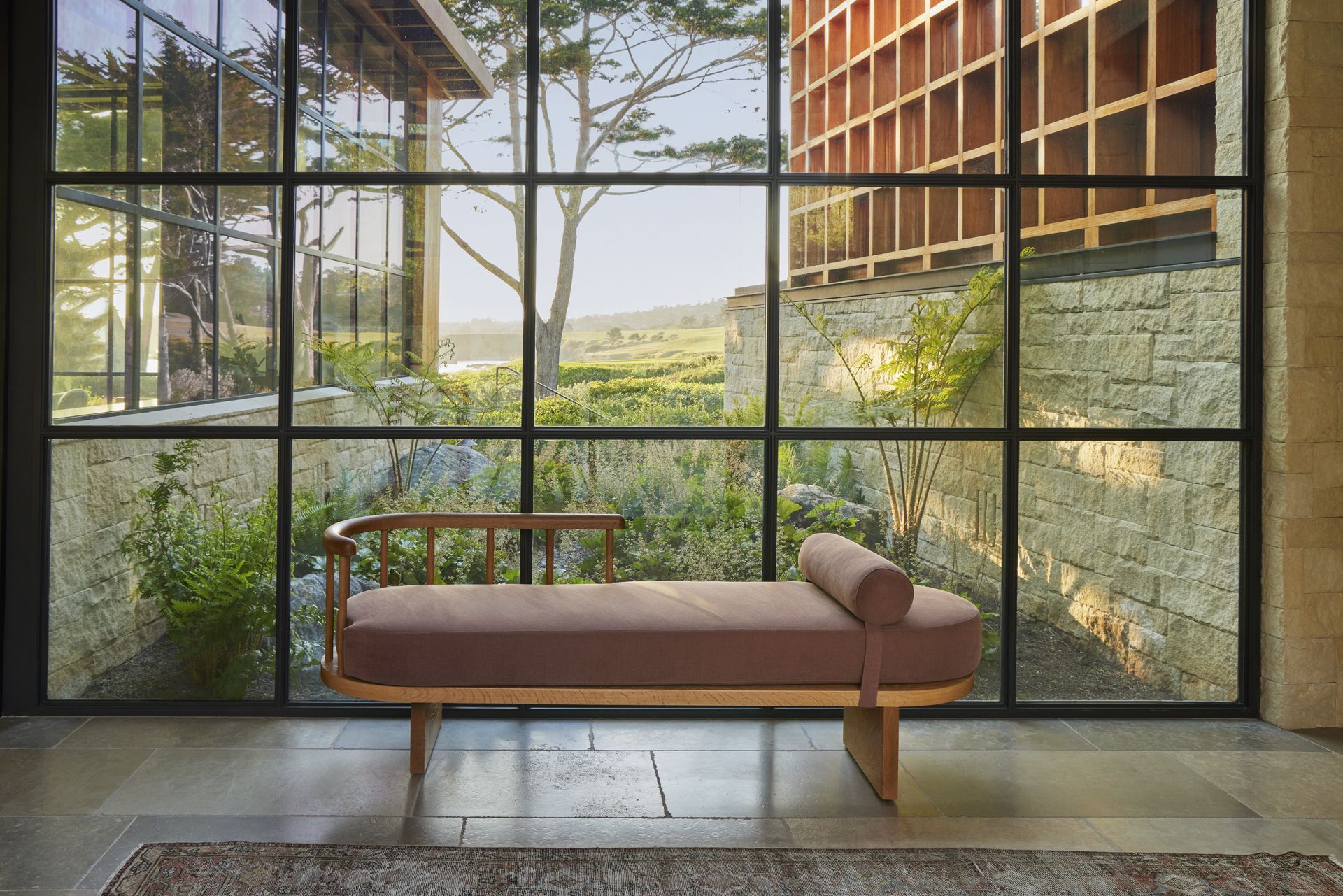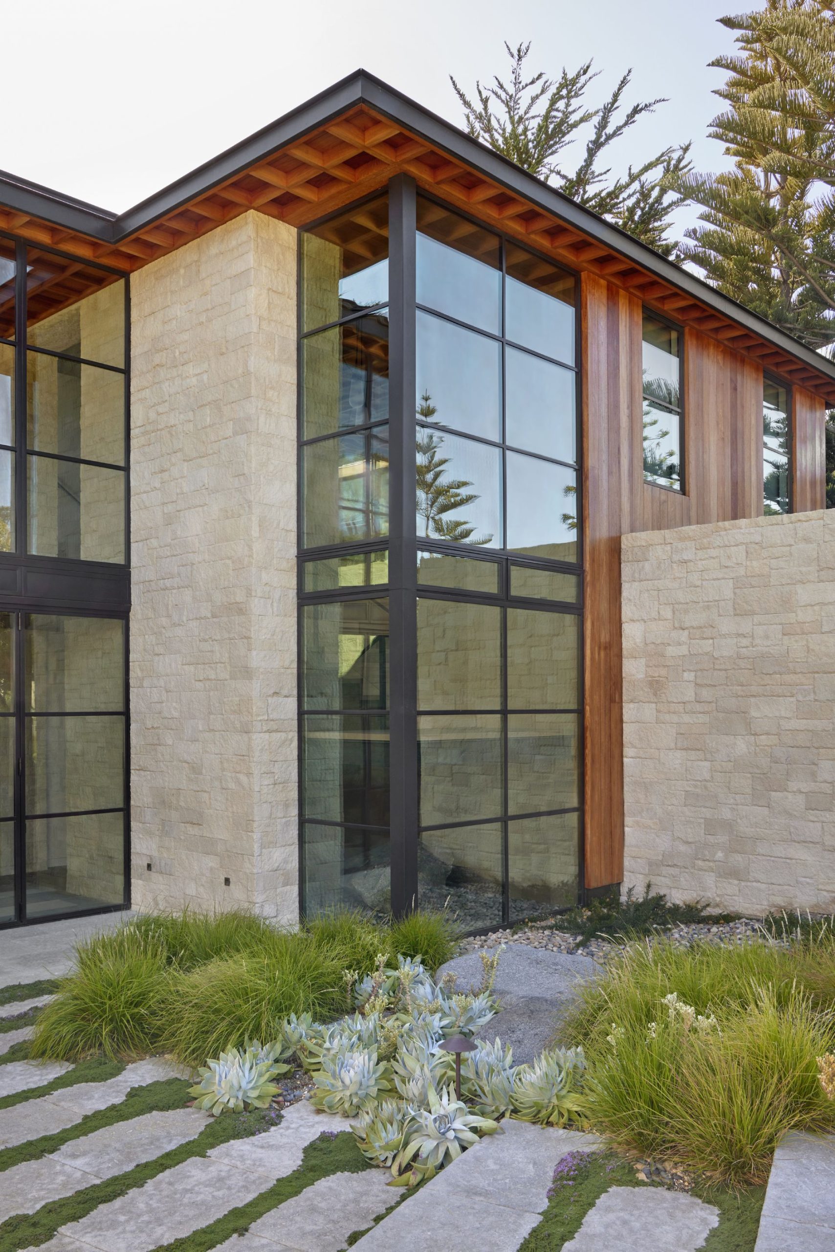 La rugosità della pietra, il calore delle sfumature del legno, la perfetta linearità dei profili metallici, i riflessi del vetro: elementi in costante dialogo con il verde e con la luce unica della California, trame illuminate in modo differente durante l’arco della giornata e lo scorrere delle stagioni.