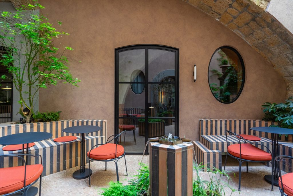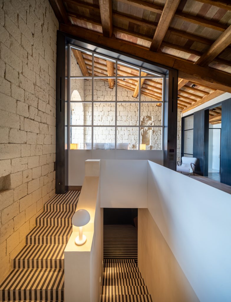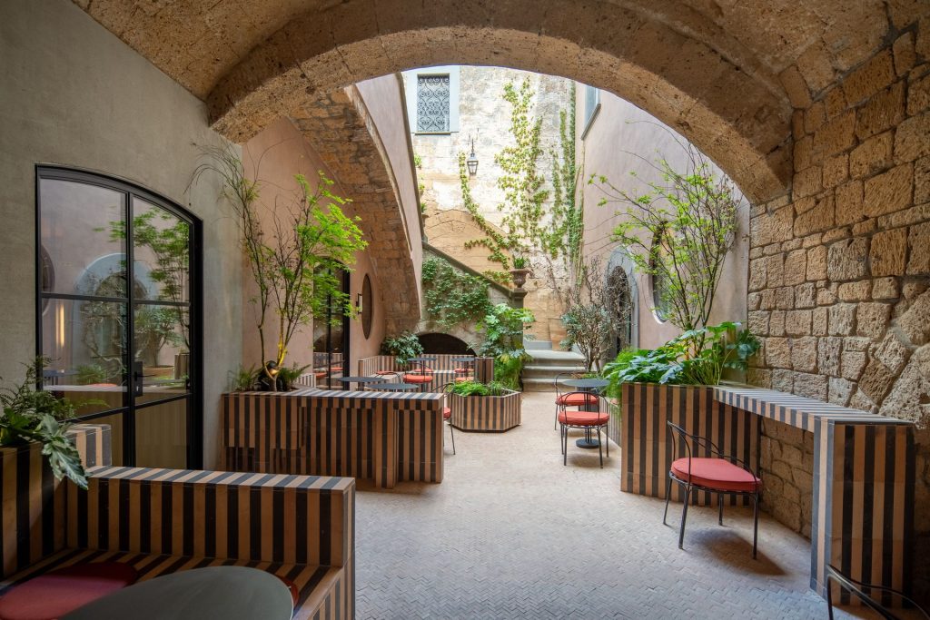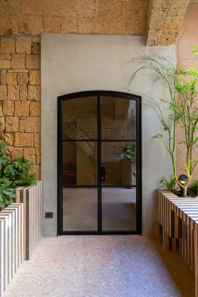 Dalla piccola ma accogliente corte d’ingresso, con i caratteristici divanetti in cotto, si distribuiscono gli ambienti della struttura che oltre alle nove camere, arredate con stile e pezzi di design contemporaneo, prevede una suite ricavata nell’antica torre e un ristorante collocato negli spazi dell’adiacente chiesa sconsacrata.