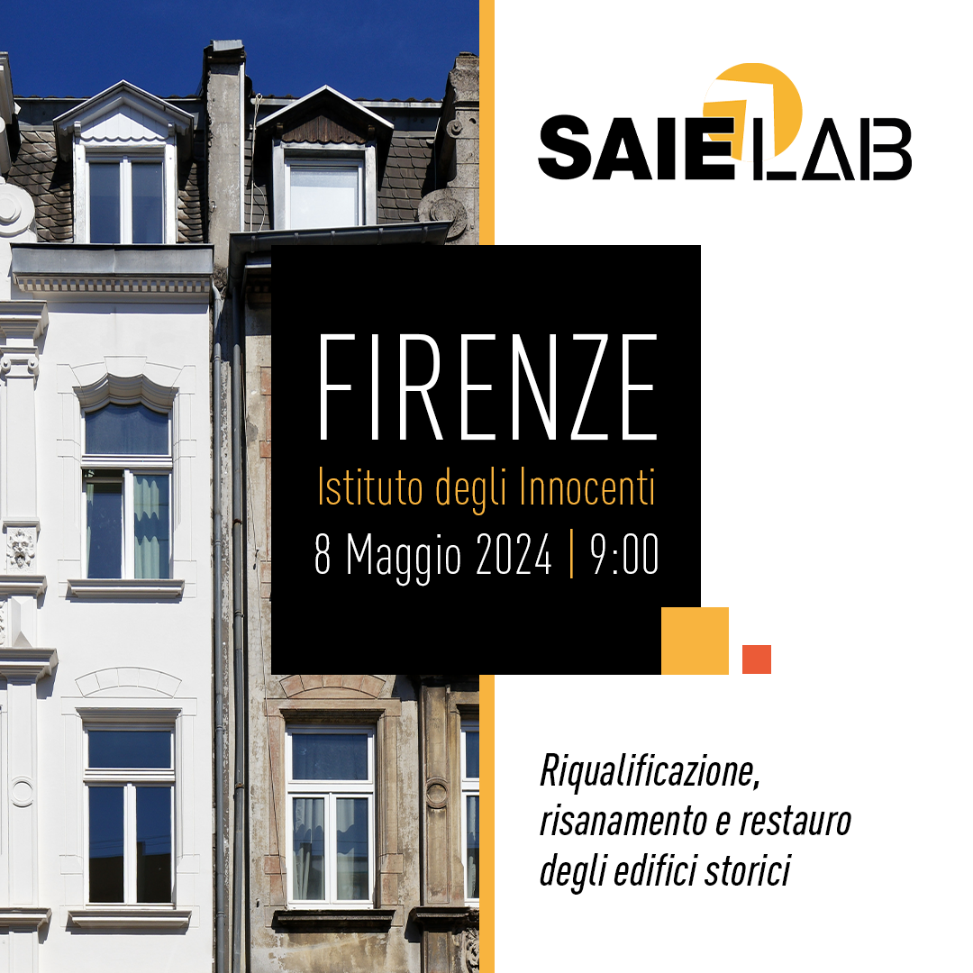 Ad ospitare la seconda tappa dei Saie Lab 2024 sarà Firenze, l’8 maggio alle ore 9.00 presso l’Istituto degli Innocenti (Piazza SS. Annunziata,12 – Firenze), con un focus dedicato al tema della riqualificazione, risanamento e restauro degli edifici storici. Il programma degli interventi è disponibile qui