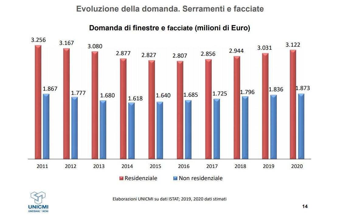 Unicmi ha presentato il Rapporto 2019 sul mercato italiano dell’involucro edilizio. Carmine Garzia, responsabile scientifico dell’Ufficio Studi Unicmi, ha illustrato i dati di un settore che è tornato a crescere sotto la spinta della ripresa degli investimenti nelle costruzioni (+3,1% nel 2018) e che presenta prospettive di sviluppo della domanda di serramenti e facciate superiori alla crescita attesa del Pil per il 2019 e per il biennio 2020-2021 (con un tasso di crescita attorno al 2,5% annuo).