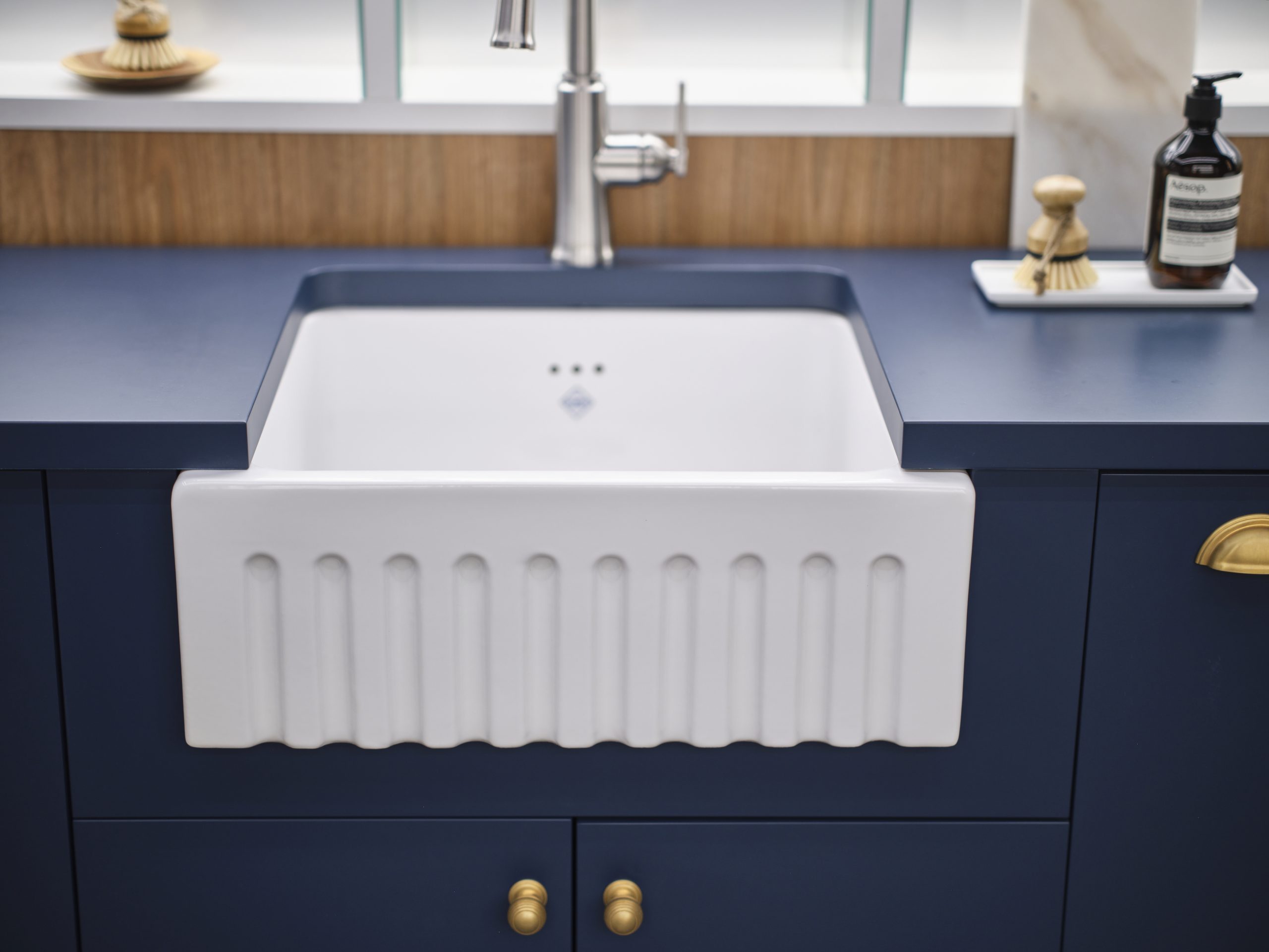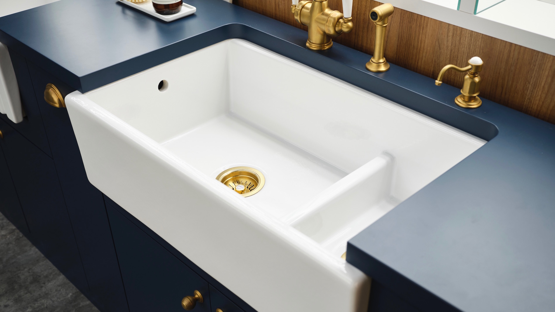 Hawkshaw è un lavello a doppia vasca frontale di Shaws. La parete divisoria tra le due vasche è sfalsata, quindi la ciotola più grande è più del doppio di quella più piccola. E la parete è alta 10 cm, mentre la profondità del lavandino è di 20 cm.