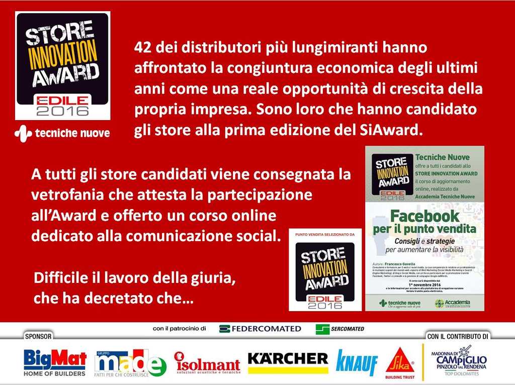 «Il Retailer of the Year rimmarrà in carica fino al settembre 2017. Perché questa è la prima edizione di un evento che vogliamo diventi un appuntamento annuale. L’idea di Ivo Nardella di creare un contest sull’eccellenza nella distribuzione di materiali edili ha consentito non solo di rilevare la percezione che ciascun distributore ha del proprio o propri punti vendita, ma anche di comparare i punti vendita e di capire che livello qualitativo è stato raggiunto dal settore.siaward_16_slide_42