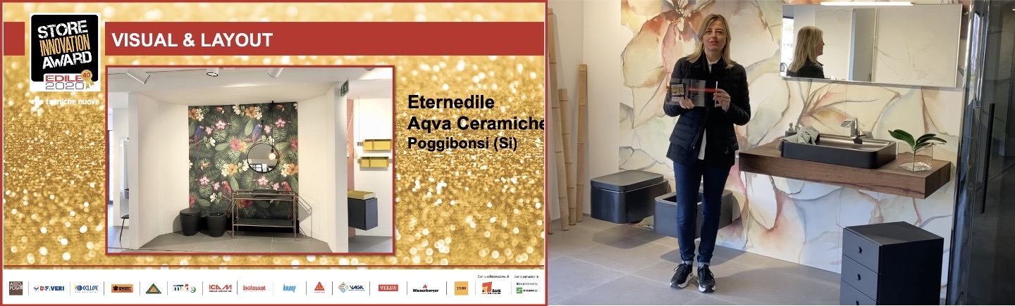 «Siamo felici di aver partecipato a questo contest e di aver ricevuto questa targa per la realizzazione del nosyto nuovo showroom di Poggibonsi che coincide con il lancio del nostro nuovo brand Aqva Ceramiche col quale ci vogliamo affermare come gruppo sul territorio nazionale con finiture e materiali di qualità, design e innovazione e un personale altamente specializzato e qualificato» Ornella Fornitori, Eternedile Aqva Ceramiche