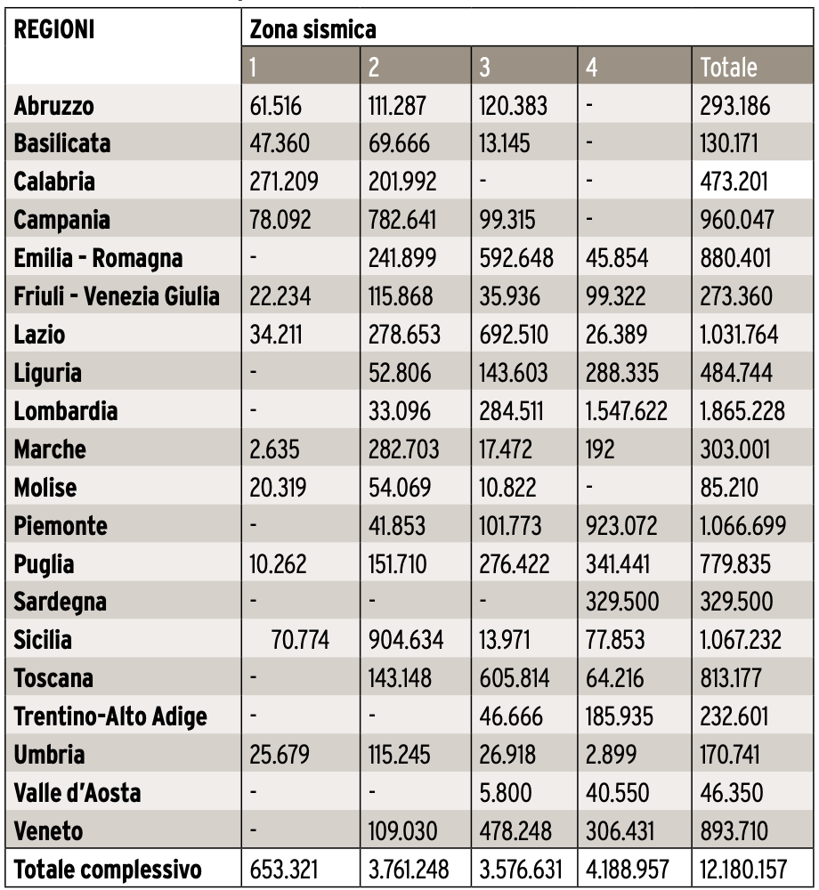 Secondo uno studio del Consiglio Nazionale degli Ingegneri, in Italia gli edifici che necessitano di interventi mirati al recupero in funzione antisismica sono pari a circa 12 milioni, il 40% del totale delle abitazioni.