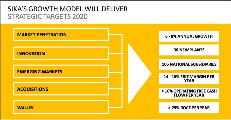 Con una crescita annua del 6-8%, Sika vuole raggiungere un margine Ebit del 14-16% e un flusso di cassa di oltre il 10% entro il 2020, quando saranno già in realizzazione altre 26 nuove fabbriche e saranno aperte sei nuove filiali nazionali stabilito. Sika intende inoltre aumentare l’Ebit a più di 1 miliardo di franchi entro il 2020. Negli ultimi cinque anni, Sika ha depositato 420 brevetti e ha lanciato sul mercato circa 1.500 nuovi prodotti.