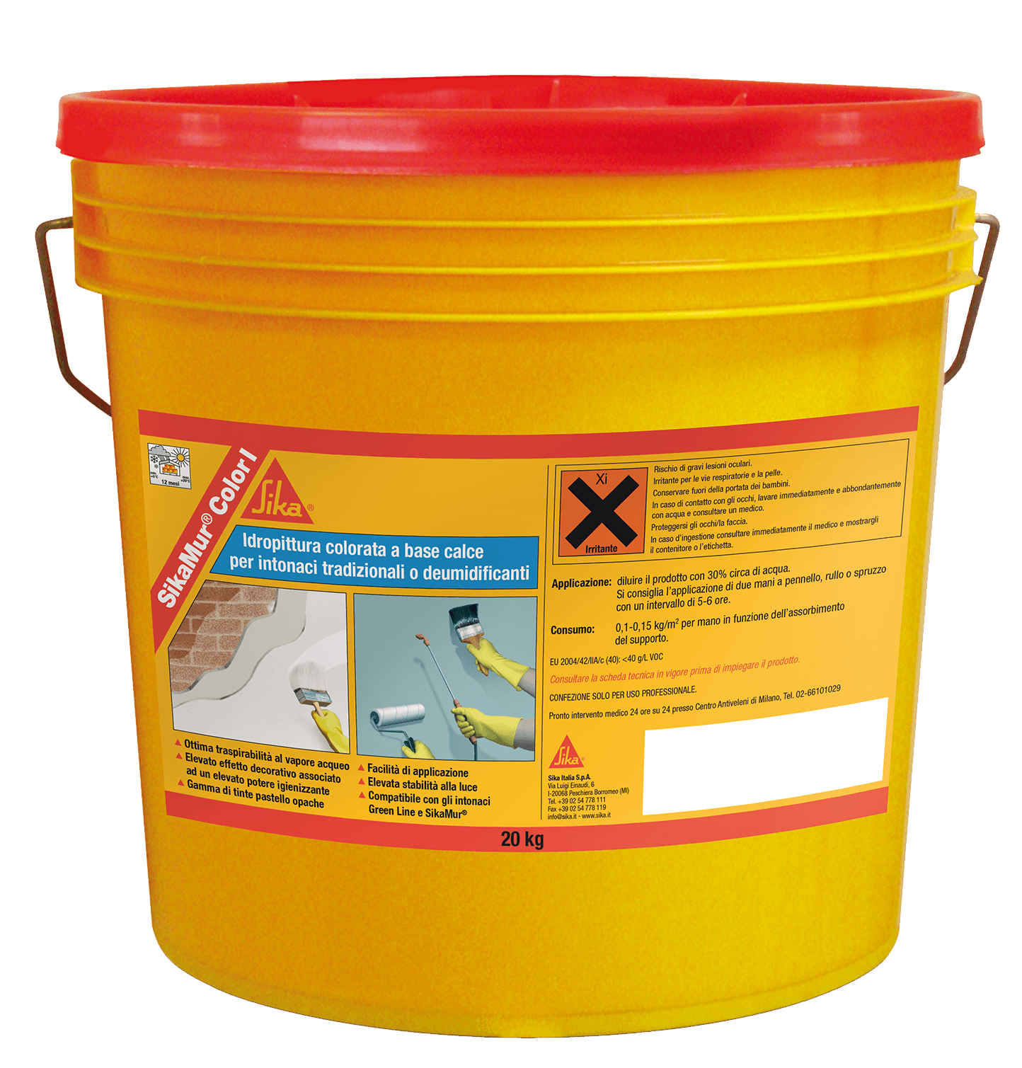SikaMur® Color I è una idropittura monocomponente a base di calce altamente traspirante particolarmente indicato quale verniciatura decorativa di intonaci deumidificanti tipo SikaMur® o vecchi e nuovi intonaci ad elevata permeabilità al vapore garantendo un valido effetto estetico associato ad un elevato potere igienizzante. Se applicato su superfici esposte agli agenti atmosferici non è in grado di resistere all’azione di atmosfere aggressive (in particolare quelle ricche di solfati) ed è soggetto all’assorbimento di acqua piovana.