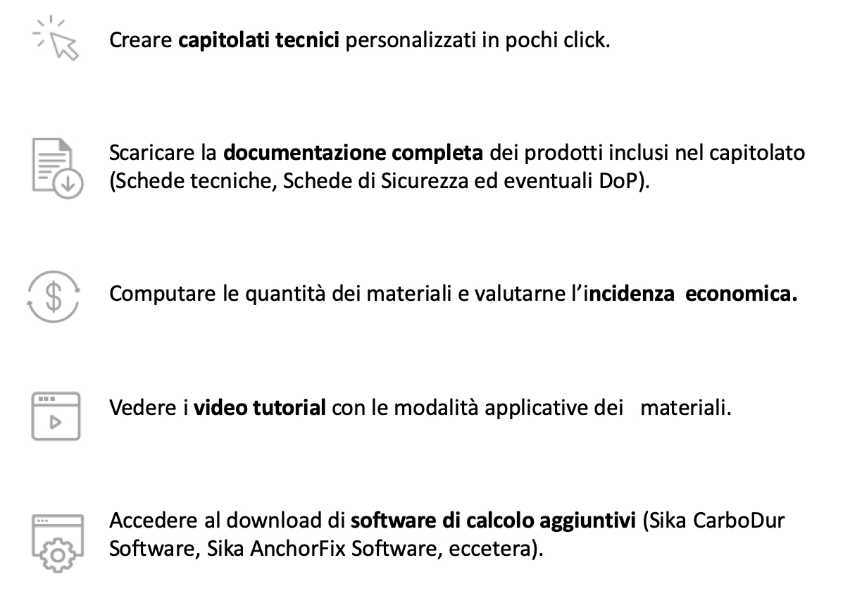 Sika Project è uno strumento gratuito di supporto ai progettisti, imprese e rivenditori che permette di creare, in maniera semplice ed intuitiva, capitolati personalizzati per molteplici lavorazioni.