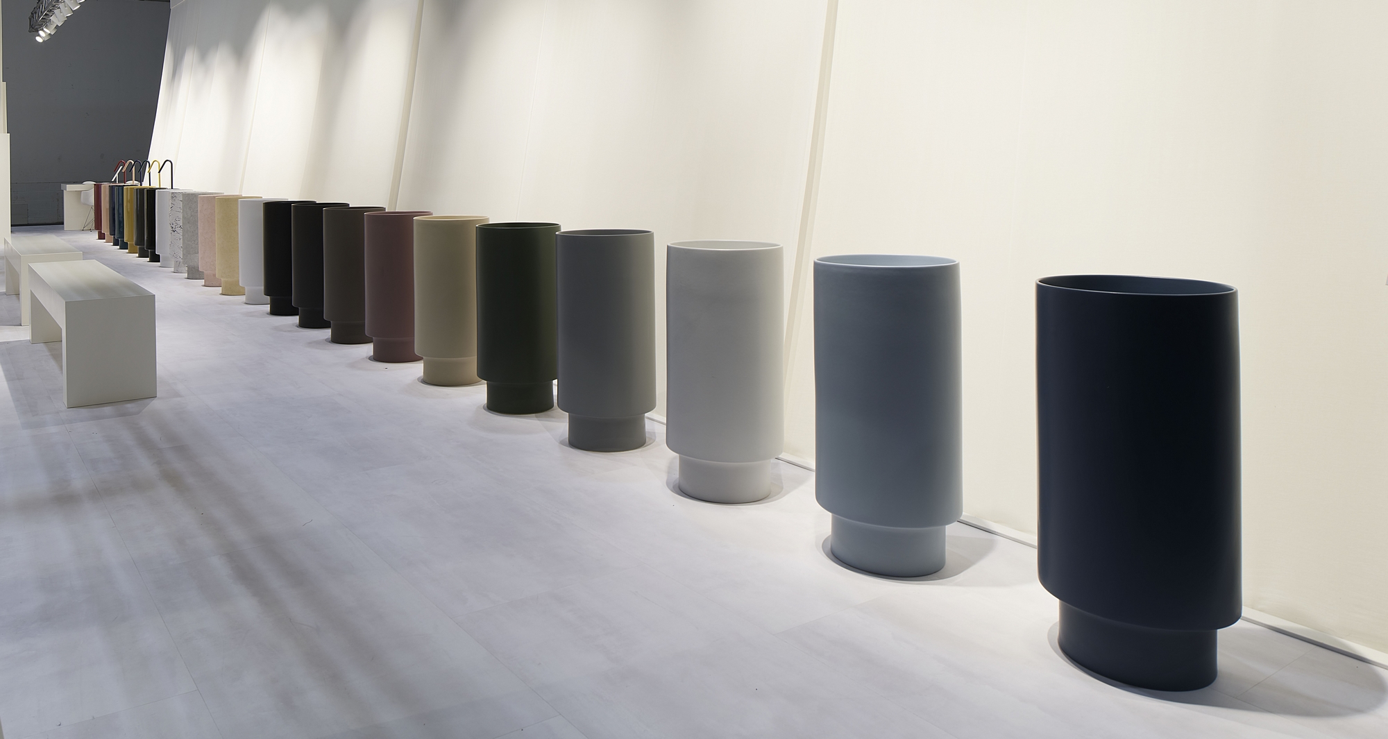 La collezione Po•mo, firmata dalla designer Terri Pecora, include un lavabo freestanding monolitico con un “gradino” alla base, dettaglio che ne sottolinea lo stile eclettico e minimale. Anche in questo caso, sono disponibili due versioni rotonde (Ø 40xH85), una per centro stanza e l’altra con scarico a parete.
