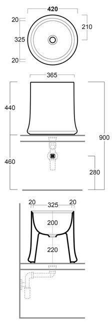 Le sue dimensioni sono: un’altezza totale di 44 cm,  una larghezza superiore di 36,5 cm, una base di 42 cm e una profondità del catino di 20 cm.