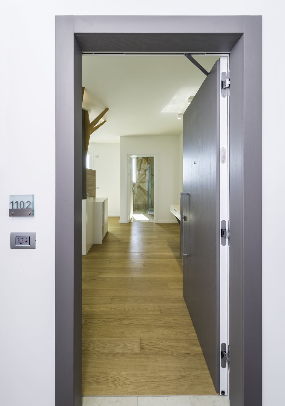 Le cerniere a scomparsa sono completamente nascoste alla vista della porta e nessun cavo elettrico è visibile anche a porta aperta. È stato così possibile utilizzare per queste porte serrature motorizzate.