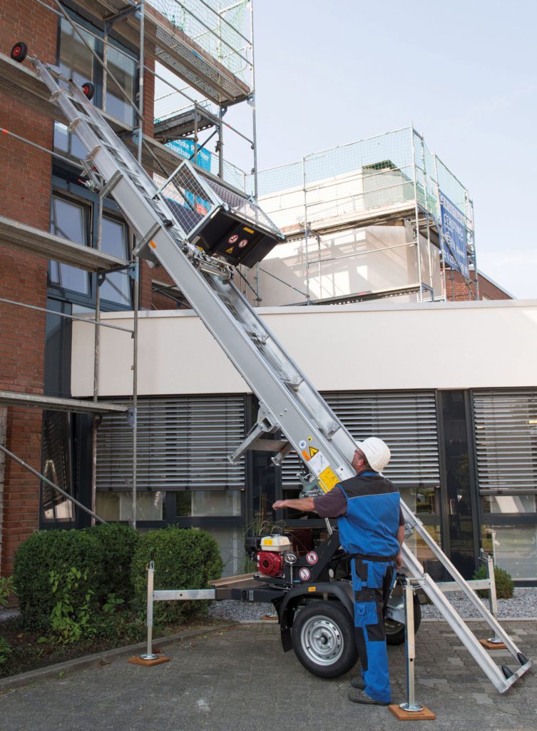 La ralla offre un raggio di azione ottimale che permette di raggiungere qualsiasi area del cantiere, mentre il verricello idraulico per il sollevamento del carico, che garantisce affidabilità e notevoli prestazioni, permette l’uscita e il rientro dei singoli profili del pacco scala a qualsiasi inclinazione.