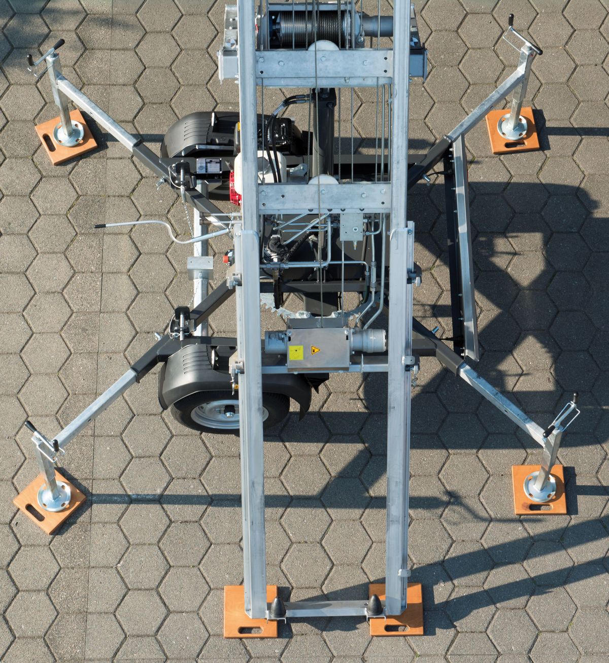 Da sottolineare anche la rapidità di piazzamento grazie al funzionamento idraulico del sollevamento e della fuoriuscita delle guide idrauliche e agli stabilizzatori facilmente estraibili.