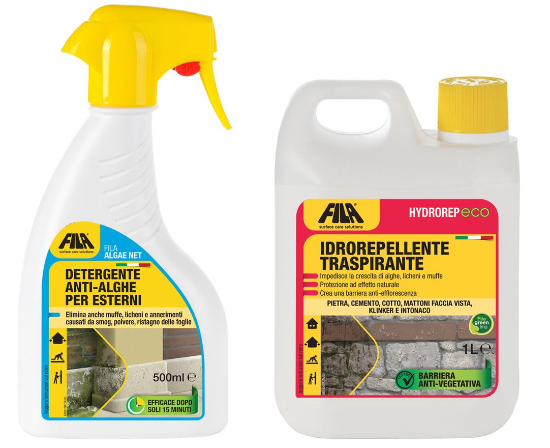 Filaalgae Net agisce rapidamente sul materiale, rimuovendo in soli 15 minuti alghe, muffe e licheni: grazie alla sua viscosità, Filaalgae Net è adatto anche per le pareti e superfici verticali, spesso soggette a questi problemi. - Hydrorep Eco è l’idrorepellente ad effetto naturale per interni ed esterni in pietra, cemento, cotto, mattoni faccia a vista, klinker, intonaco e pitture murali, che difende la superficie dal degrado causato dagli agenti atmosferici. Dopo aver rimosso muffe e licheni, Hydrorep Eco protegge le superfici ostacolando la crescita di microrganismi e creando una barriera anti vegetativa resistente ai raggi Uv.
