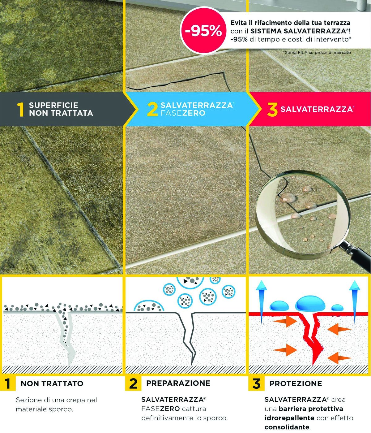 Idrorepellente traspirante. Salvaterrazza, protettivo consolidante anti infiltrazioni a base solvente, protegge, consolida e ripara le superfici, non crea alcun film superficiale, bensì impermeabilizza il terrazzo lasciando traspirare il materiale e facendo evaporare naturalmente l’umidità. Trattamento idrorepellente traspirante ad effetto consolidante che protegge le fughe, è in grado di impermeabilizzare il terrazzo grazie ad una formula sviluppata da Fila: l’impermeabilizzante entra nelle fessure e nelle micro lesioni superficiali del materiale, respinge l’acqua grazie alla sua formula idrorepellente ne ricostruisce e consolida la struttura diventando «un corpo unico con il materiale». L’idrorepellenza del prodotto è testata dal Centro ceramico di Bologna (Uni-En 15802:2004).