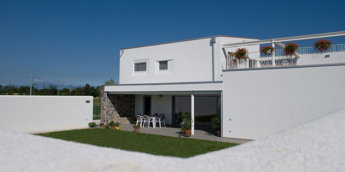 Le scelte energetiche e di sostenibilità. Bioclimatica: orientamento, forma dell’edificio e distribuzione dei locali sono stati pensati in modo tale da massimizzare il guadagno solare gratuito a sud e minimizzare le dispersioni di calore in regime invernale a nord. Particolare attenzione è stata posta al controllo del soleggiamento sui fronti più caldi ed esposti, attraverso la progettazione del portico fisso e dell’utilizzo di veneziane motorizzate regolabili poste entro vetro, alcune accessibili collocate all’esterno del serramento in una camera separata, al fine di poter diversamente regolare la percentuale di ombreggiamento. Al piano primo, sui fronti caldi sud ed ovest, delle strombature modulano l’ingresso della luce bloccando i raggi incidenti più critici. Le aperture creano in regime estivo una ventilazione naturale passante verticale nord/sud, con motore il vento e con camino il corpo scala. Allo stesso modo i venti prevalenti, provenienti da nord-est, vengono schermati nel cortile dall’edificio stesso ad L e sulla terrazza da due alti muri.
