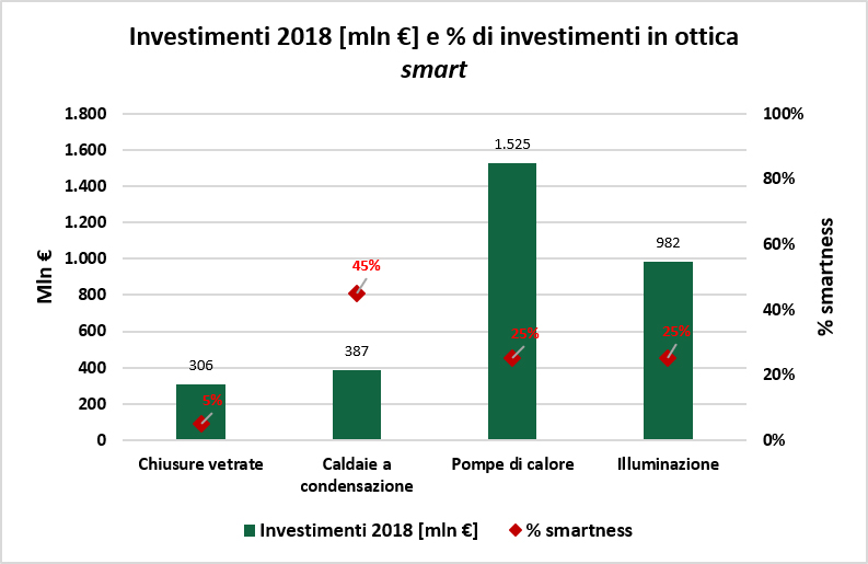 Smart Building Report 2019 | Grafico degli investimenti in efficienza energetica nel settore terziario e residenziale. In rosso viene espressa la percentuale degli investimenti smart rispetto al totale.